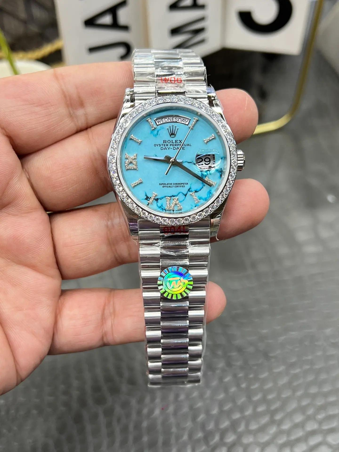 1:1 clone of the Rolex Day-Date 128349RBR-0031 with turquoise dial