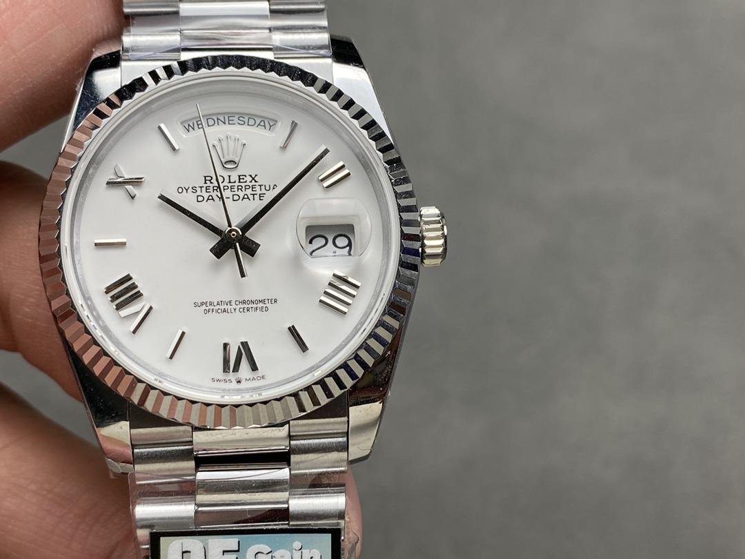 Rolex Day Date 36 watch with white dial and white gold fluted bezel m128239 0059 President