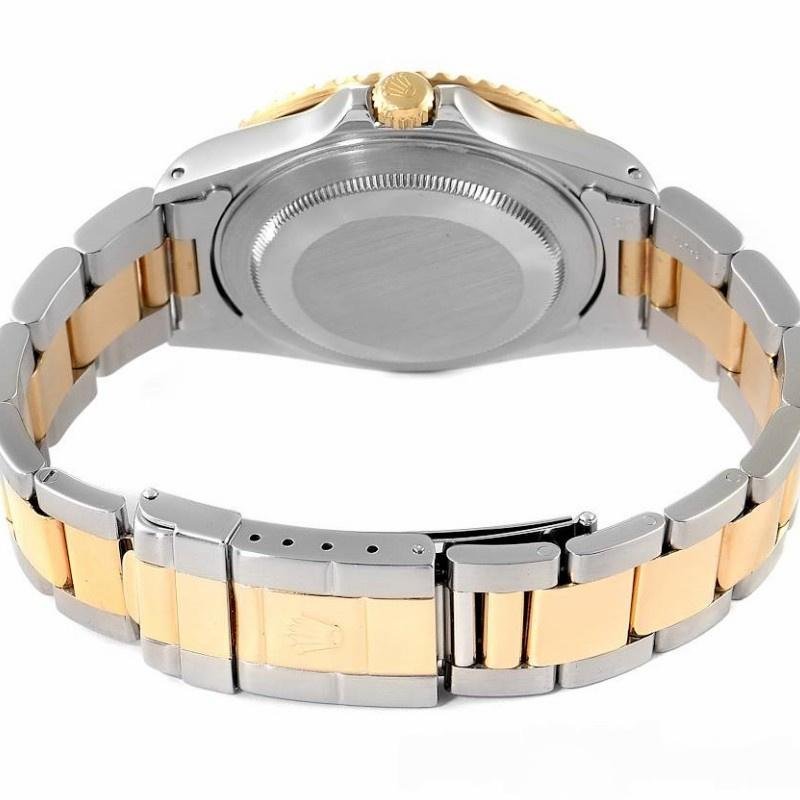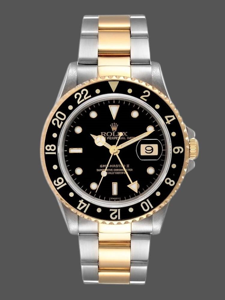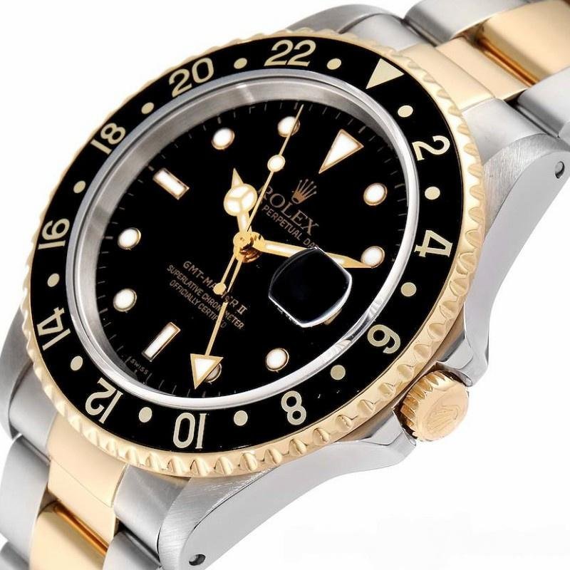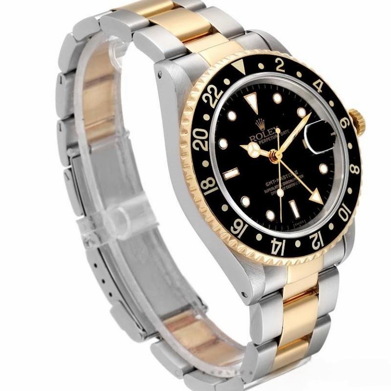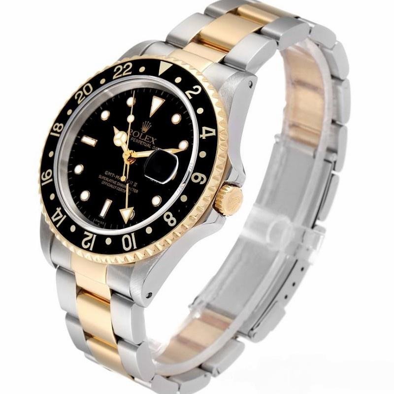 The Rolex GMT-Master II 16713LN, replica steel, yellow gold, black dial, 40 mm, for men, features a 40 mm brushed and polished Oystersteel stainless steel case and polished solid yellow gold. Two-way 18K polished solid yellow gold swivel bezel with black insert and 24-hour engraved numbers and graduations. Black dial with luminescent hands and dotted hour markers. Date window at 3. Oyster stainless steel and yellow gold bracelet with folding clasp. Fits 19cm wrists.