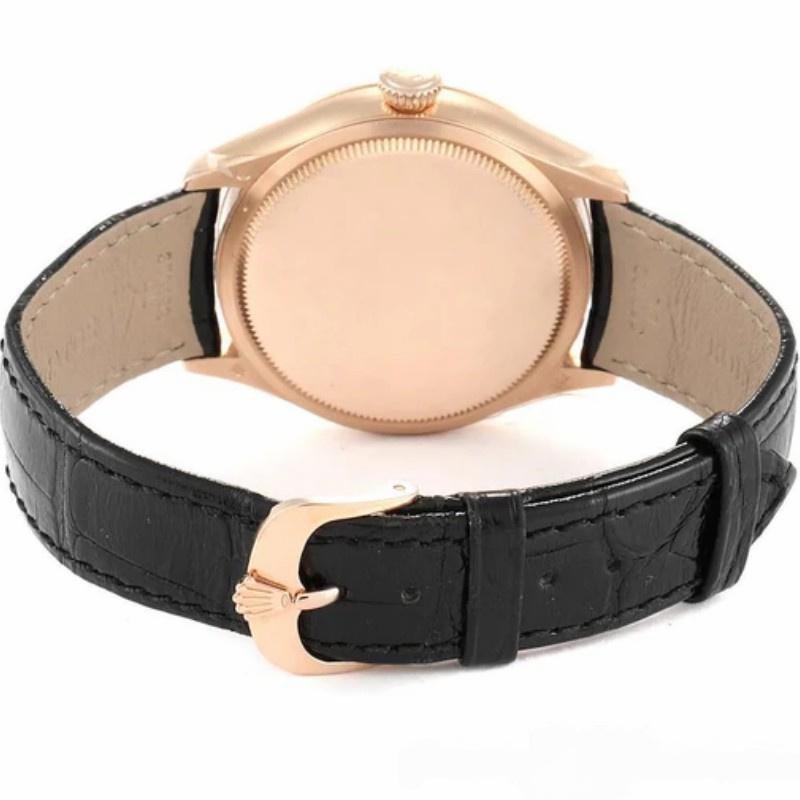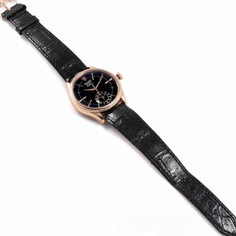 Rolex Cellini Dual Time 50525 replica watch for men, black dial, black leather strap, 39 mm. 39mm diameter round rose gold case. Scratch resistant sapphire crystal. Black guilloch?? dial with sun effect and baton-type hour markers in embossed polished white gold. Elegant printed minutes and seconds indicator. Central hour, minute and second hands in white gold. Second time zone at 6 a.m. with day/night indicator. Black alligator leather strap with rose gold herringbone buckle.