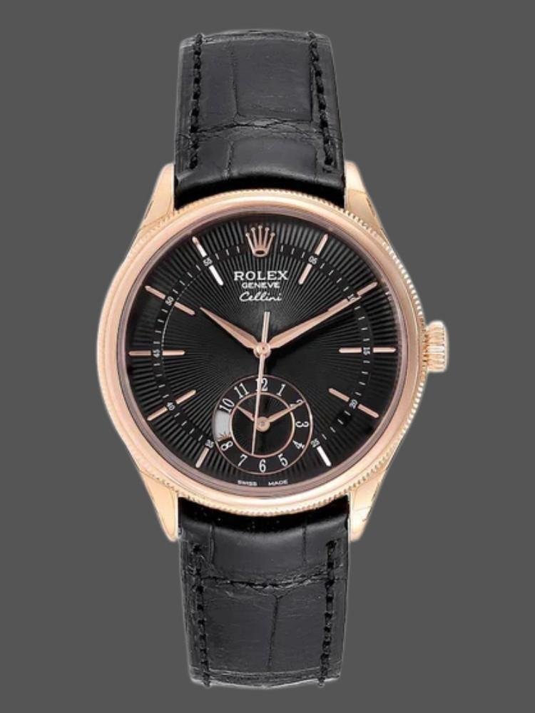 Rolex Cellini Dual Time 50525 Men’s Watch Replica Black Dial Black Leather Strap 39mm