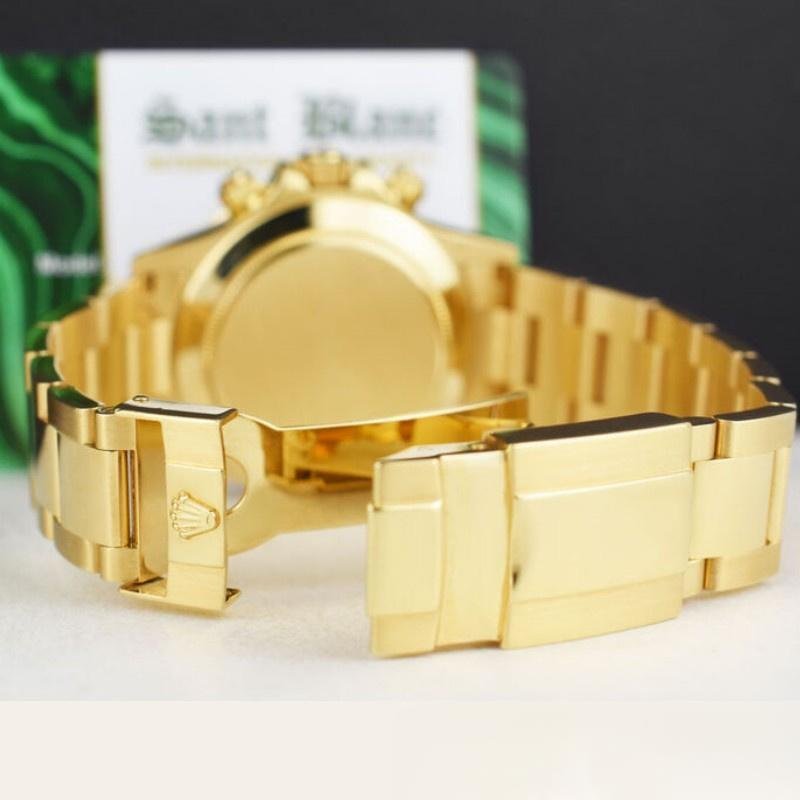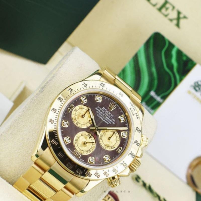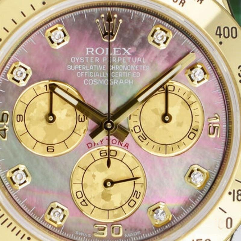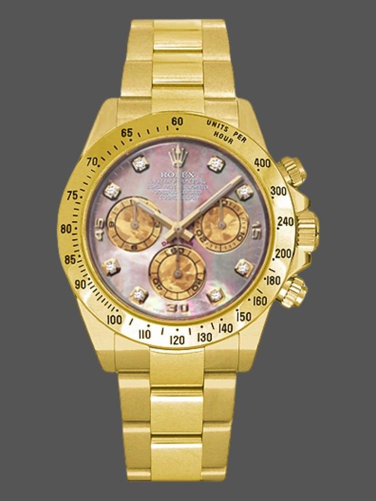 Rolex Cosmograph Daytona 116528 replica watch for men, black mother-of-pearl dial with diamonds, 40 mm. 40 mm diameter yellow gold case. Yellow gold bezel with tachymetric engraving. Scratch resistant sapphire crystal. Black mother-of-pearl dial with diamond hour markers. 1/5 second external indicator. Three auxiliary spheres with a gold outline for the seconds, 12 hours and 30 minutes. Luminous cane-type hands in yellow gold. Yellow gold Oyster bracelet with safety clasp.