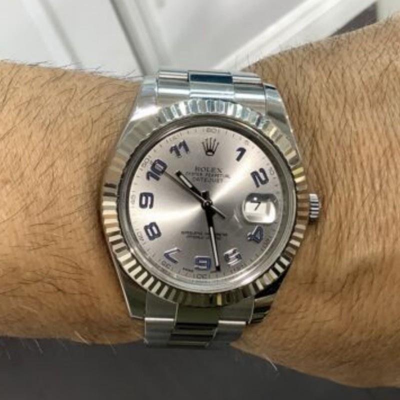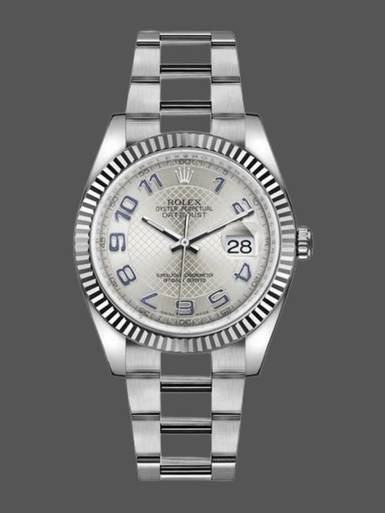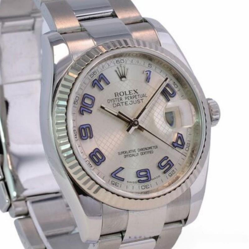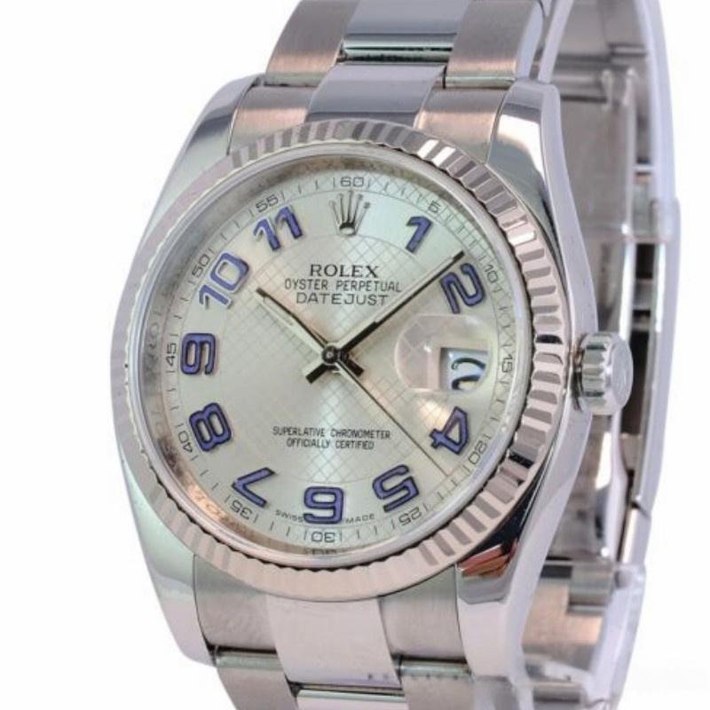 Rolex Datejust 116234 watch, unisex replica, silver dial, knurled bezel, 36 mm. 36mm stainless steel case. Silver dial, blue Arabic numeral hour markers, solid white gold fluted bezel, date window at 3 o’clock, Cyclops lens over date, stainless steel Oystersteel bracelet, Oysterclasp folding clasp with Comfort extension link.