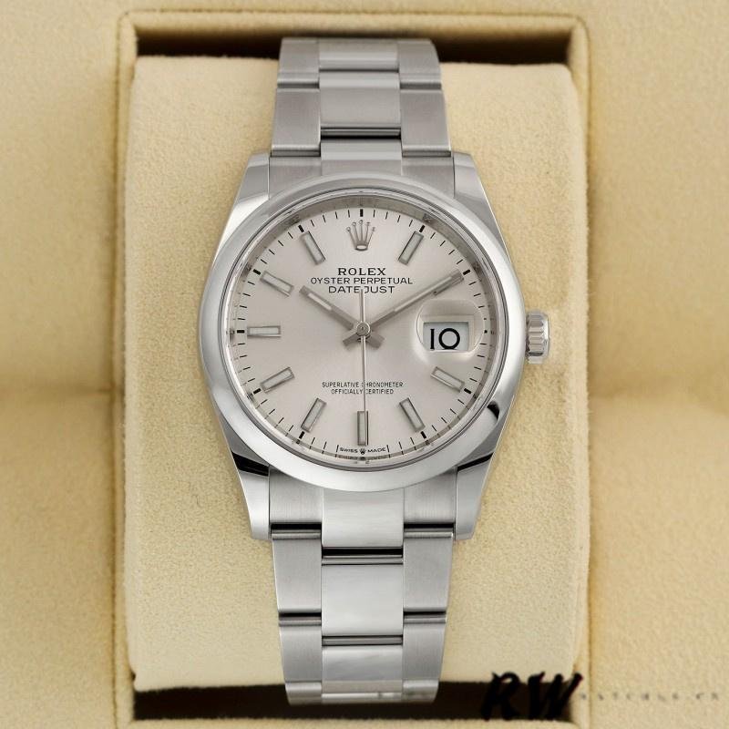 Replica Rolex Datejust 126200 unisex stainless steel watch with silver dial and 36 mm indices