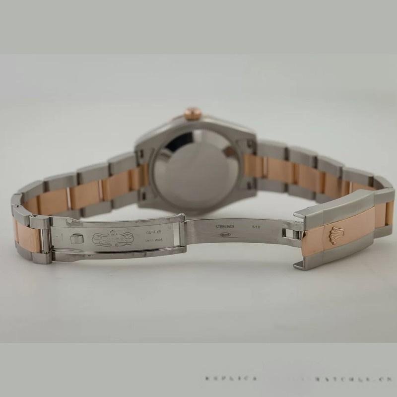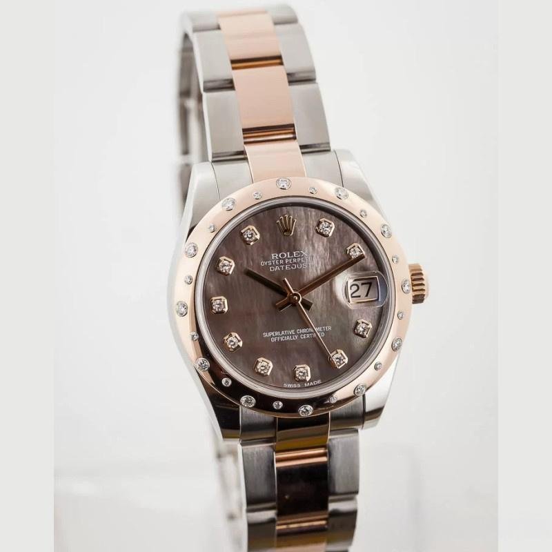 Rolex Datejust 178341 women’s watch with black mother-of-pearl dial and diamonds, 31 mm. 31 mm Rolesor Everose case in Oystersteel and Everose gold, screwed back and crown with double Twinlock sealing system, Everose gold domed bezel with 24 diamonds set, scratch-resistant sapphire crystal with Cyclops lens on the date, black mother-of-pearl dial set with 10 diamond hour markers, calendar with window at 3 o’clock. Available in two tones with stainless steel and rose gold bracelet with folding clasp.