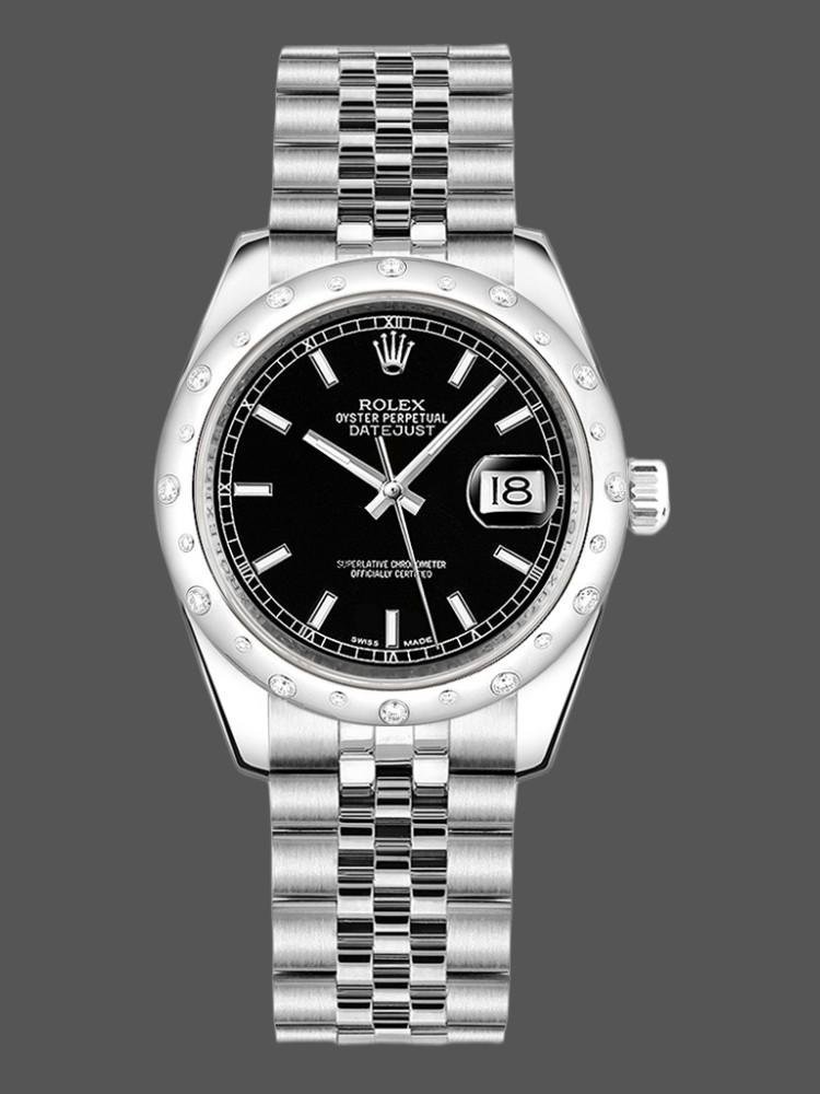 Rolex Datejust 178344 replica watch for women, black dial, stainless steel, 31 mm. 31mm stainless steel case, white gold domed bezel with 24 diamonds set. Black dial with hourly indexes. Display at 3 o’clock. Scratch resistant sapphire crystal. Five-link Oystersteel Jubilee bracelet with hidden Crownclasp folding buckle.