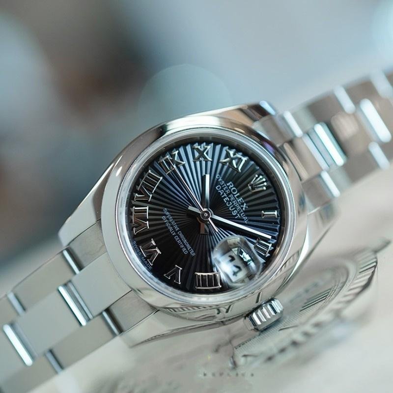 Rolex Datejust 179160 replica watch with Oyster Sunbeam bracelet, black Roman dial, 26 mm, 26 mm diameter stainless steel case. Screw-down crown. Scratch resistant sapphire crystal. Black Sunbeam dial with embossed Roman numerals. Calendar window at 3. A smooth bezel and sleek stainless steel Oyster bracelet with flat links enhance the modern style of this women’s watch, while offering a comfortable, wrist-resistant fit.