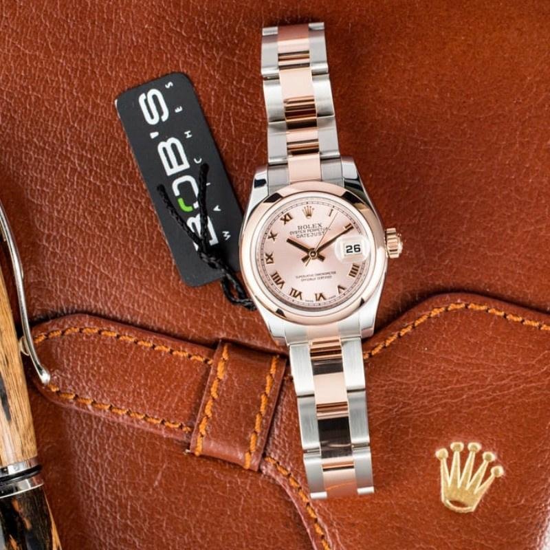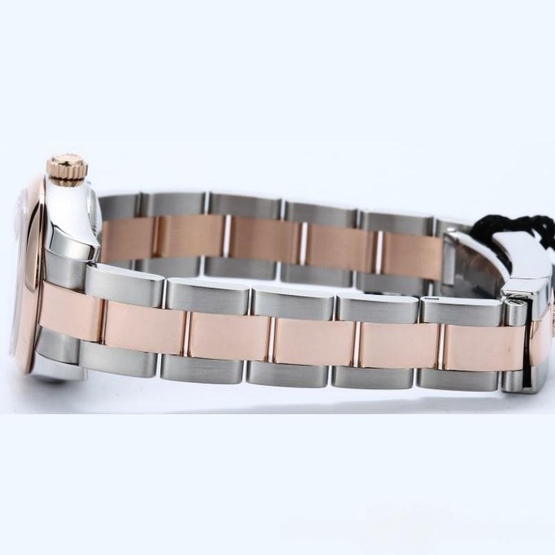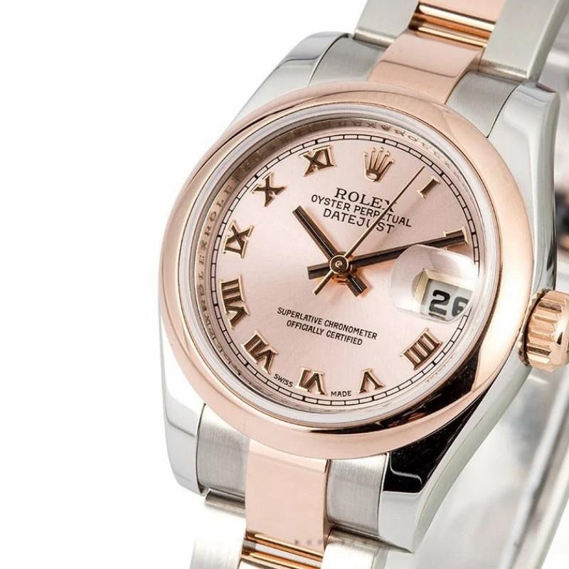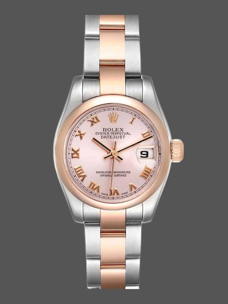 Rolex Datejust 179161 women’s watch, stainless steel and Everose gold, pink Roman dial, 26 mm. 26mm polished stainless steel case and smooth rose gold bezel. Rose gold Twinlock crown. Pink dial with polished rose gold hands. Time markers with Roman numerals applied in rose gold. Date window with Cyclops magnifying glass at 3. Polished stainless steel and rose gold Oyster style bracelet with Oyster folding clasp.