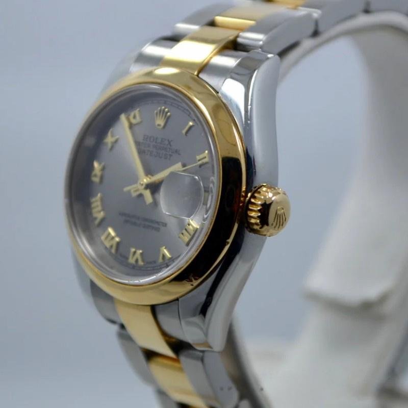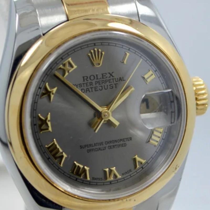 Rolex Datejust 179163 replica watch for women, gray dial, domed bezel, 26 mm. 26mm yellow gold stainless steel case, domed bezel. Gray dial with Roman numeral hour markers. Date display at 3. Scratch resistant sapphire crystal. Screw-down crown. The reliable yellow gold and stainless steel Oyster bracelet will look perfect on your wrist.