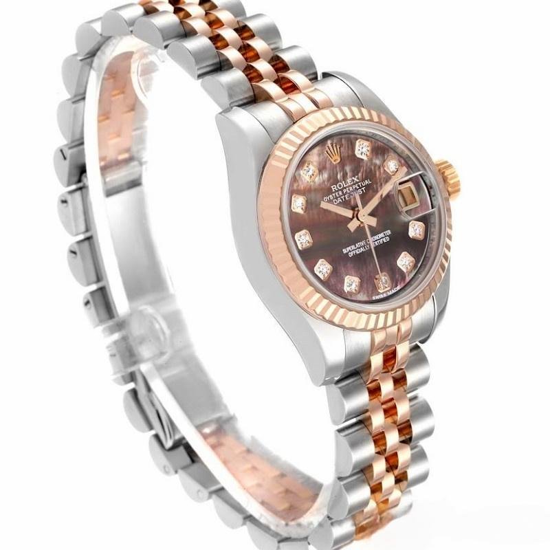 Rolex Datejust 179171 replica watch for women, black mother-of-pearl and diamond dial, 26 mm. 26mm stainless steel case with rose gold crown. Rose gold fluted bezel. Black mother-of-pearl dial with diamond hour markers. Date display window located at the 3 o’clock position. Two-tone rose gold and stainless steel jubilee bracelet.