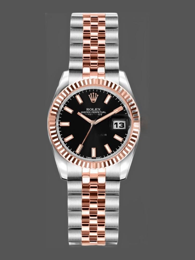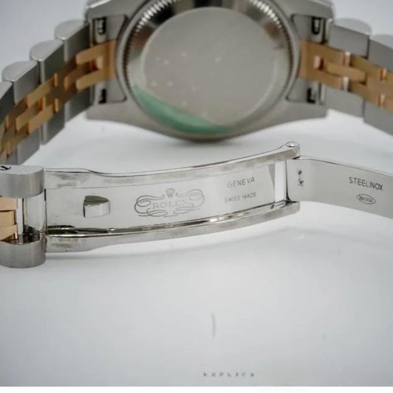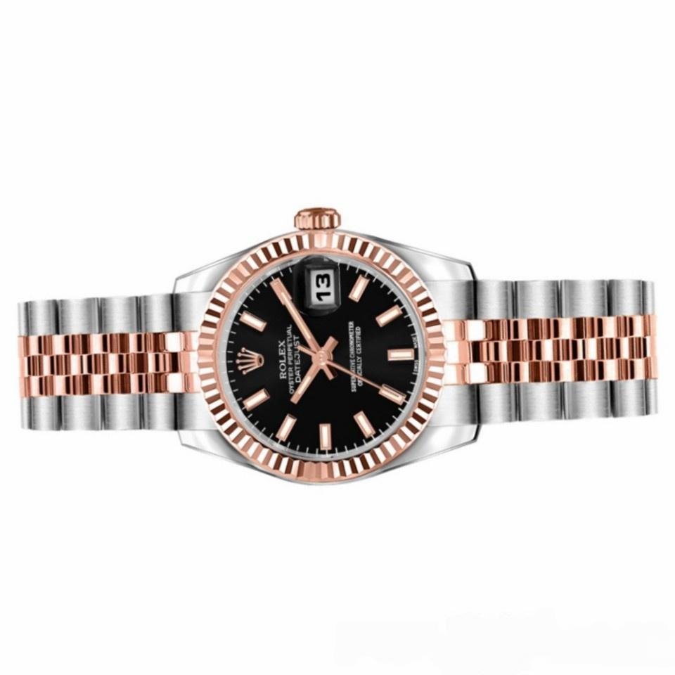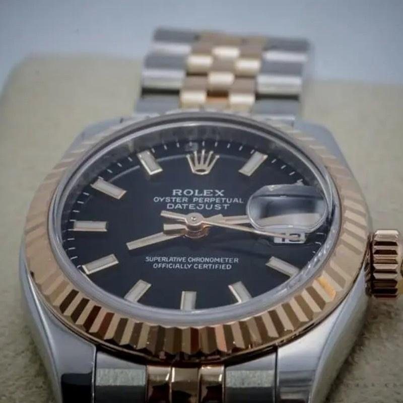 Automatic: Lifetime water resistant, Swiss: 30 meters, TOP: 100 meters Availability: Available item Return policy: If you are not satisfied with our product, please return your watch within 30 days for a full refund. Condiciones return. Rolex Datejust 179171 women’s watch, black dial, fluted bezel, 26mm. 26mm stainless steel case with rose gold crown. Rose gold fluted bezel. Black dial with index hour markers. Date display window located at the 3 o’clock position. Two-tone rose gold and stainless steel jubilee bracelet. Customer reviews