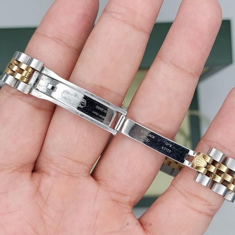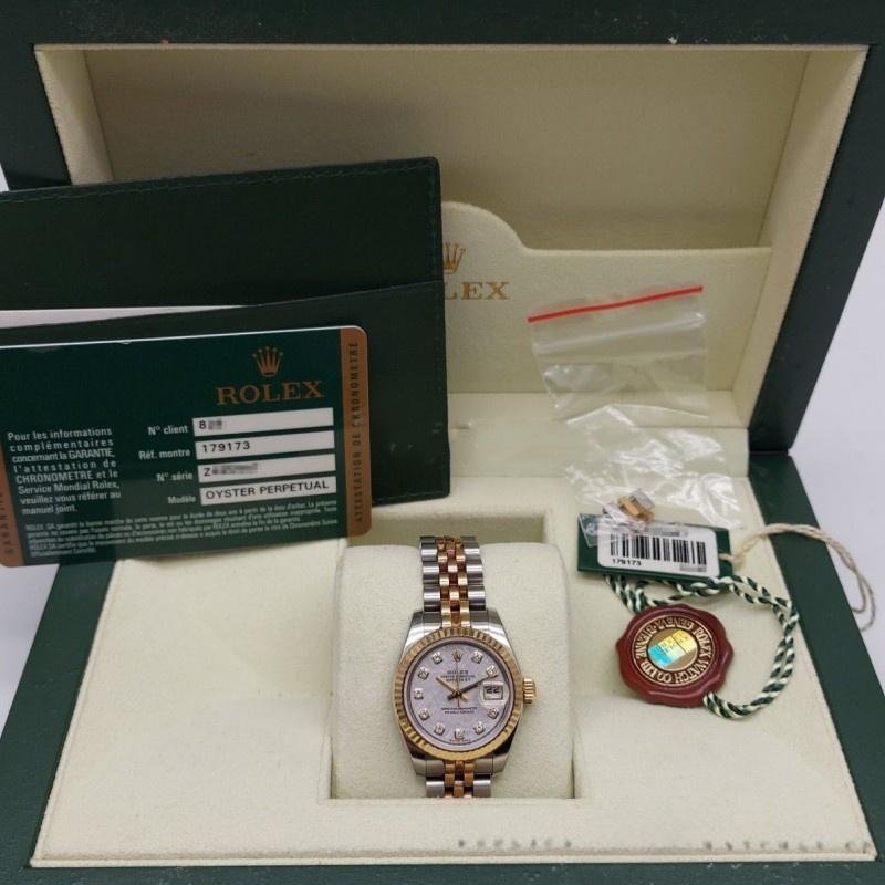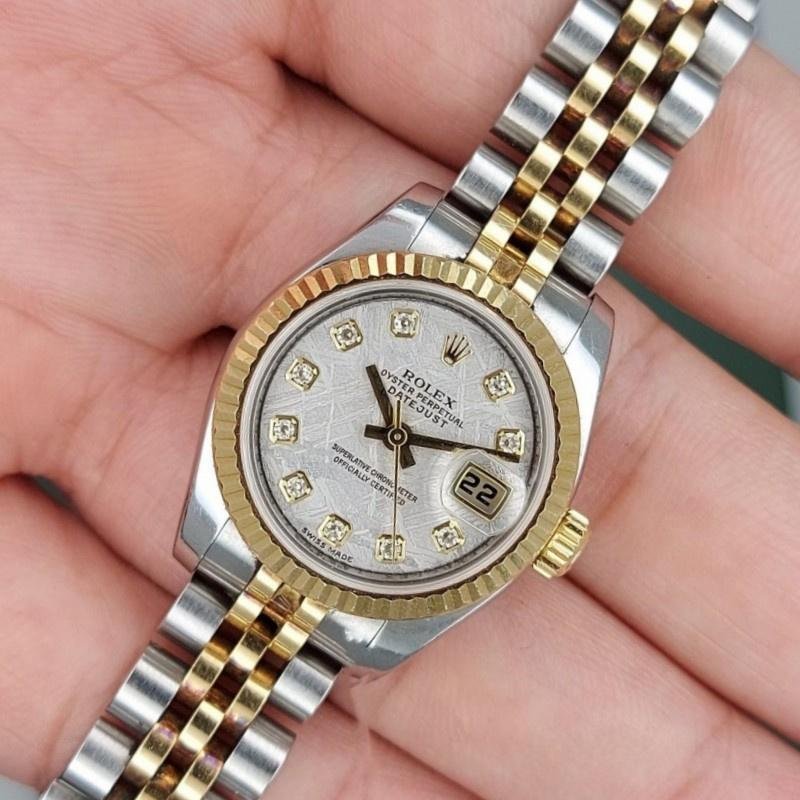 Rolex Datejust 179173 replica watch for women, meteorite gray dial with fluted bezel and diamonds, 26 mm. 26 mm diameter stainless steel Oyster case. Yellow gold fluted bezel. Scratch resistant sapphire crystal with Cyclops magnifying glass. Meteorite gray dial with diamond hour markers. Calendar with window at 3. Jubilee stainless steel and yellow gold bracelet with hidden clasp.