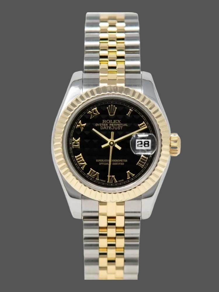 Rolex Datejust 179173, black dial, fluted bezel, 26 mm, replica for women. 26 mm diameter stainless steel Oyster case. Yellow gold fluted bezel. Scratch resistant sapphire crystal with Cyclops magnifying glass. Black dial with Roman numeral hour markers. Calendar with window at 3. Jubilee stainless steel and yellow gold bracelet with hidden clasp.