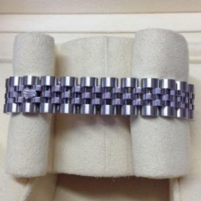 Rolex Datejust 179174 replica watch for women, black Roman dial, knurled bezel, 26 mm. 26mm diameter stainless steel Oyster case. White gold fluted bezel. Scratch resistant sapphire crystal with Cyclops magnifying glass. Black dial with Roman numeral markers. Calendar with window at 3. Jubilee stainless steel bracelet with hidden clasp.