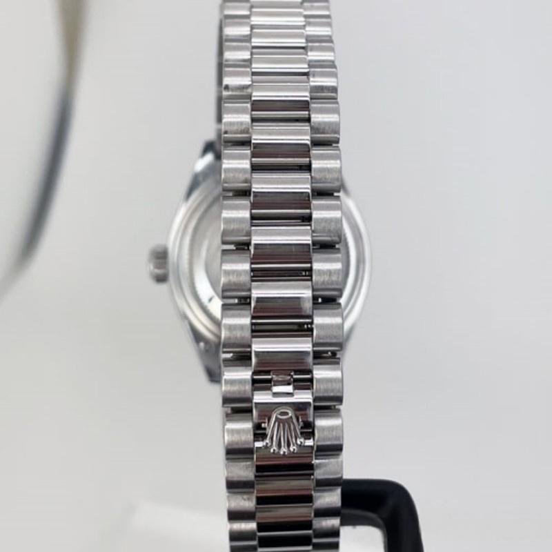 Rolex Datejust 279166 women’s watch, replica, dark gray dial with diamonds and domed bezel, 28 mm. It features a 28mm polished platinum case and a fixed domed polished platinum bezel. Scratch resistant sapphire crystal with Cyclops magnifying glass. Dark gray dial with diamond hour markers. Calendar with window at 3. Polished platinum President bracelet with Crownclasp folding buckle.