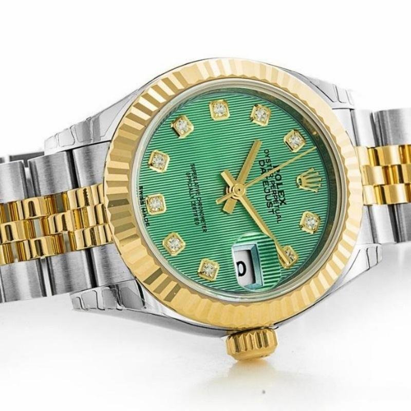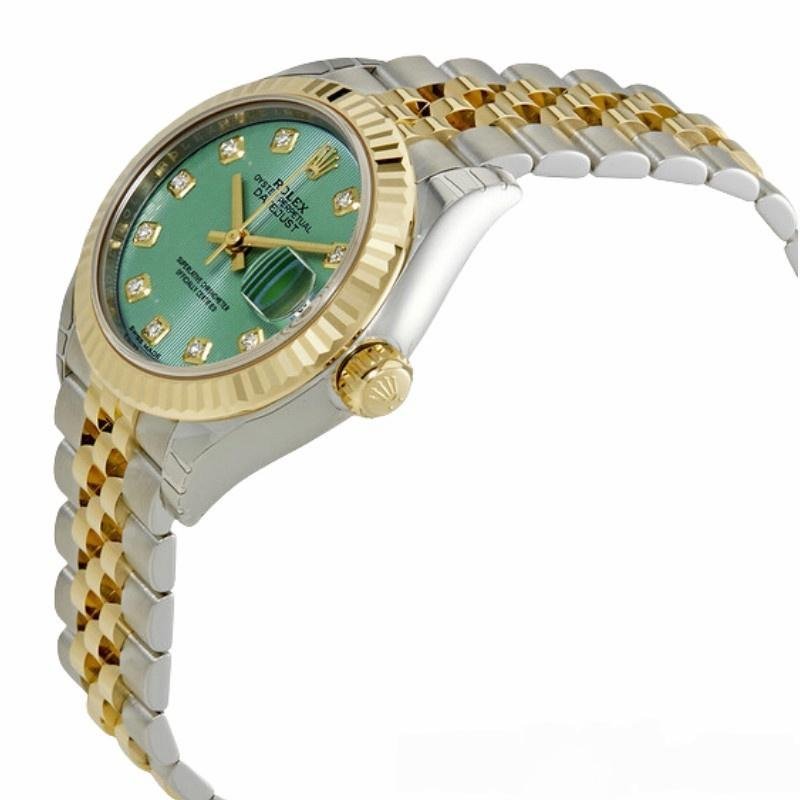 Rolex Datejust 279173 women’s watch with green diamond dial and 28mm fluted bezel. 28mm yellow gold case and polished solid yellow gold fluted bezel. Scratch resistant sapphire crystal with Cyclops magnifying glass. Green dial with diamond hour markers. Calendar with window at 3. Stainless steel bracelet with yellow gold center links.
