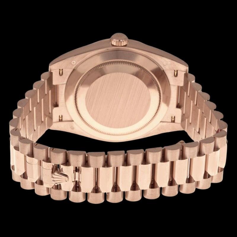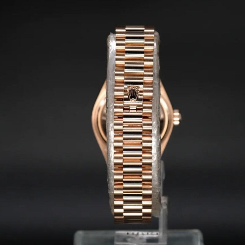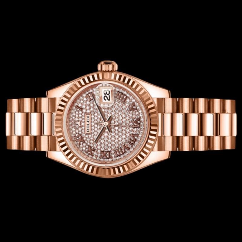 Rolex Datejust 279175 women’s watch, replica, diamond pav?? dial, fluted bezel, 28 mm. 28mm round rose gold case with screw-down crown and rose gold fluted bezel. Diamond pav?? dial with hour markers in Roman numerals. Calendar with window at 3. Everose gold President bracelet with three-piece semicircular links and hidden Crownclasp folding clasp.