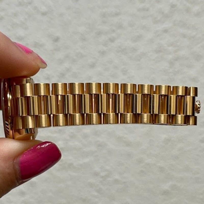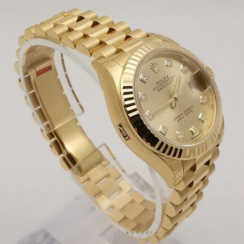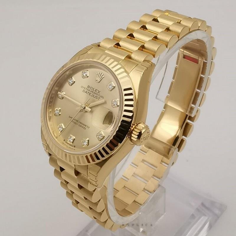 Rolex Datejust 279178 replica watch for women, champagne fluted bezel, 28 mm, 28 mm round yellow gold case with screw-down crown and gold fluted bezel yellow. Champagne-colored dial with diamond indexes. Date window at 3 o’clock. Yellow gold President bracelet with three-piece semicircular links and hidden Crownclasp folding clasp.