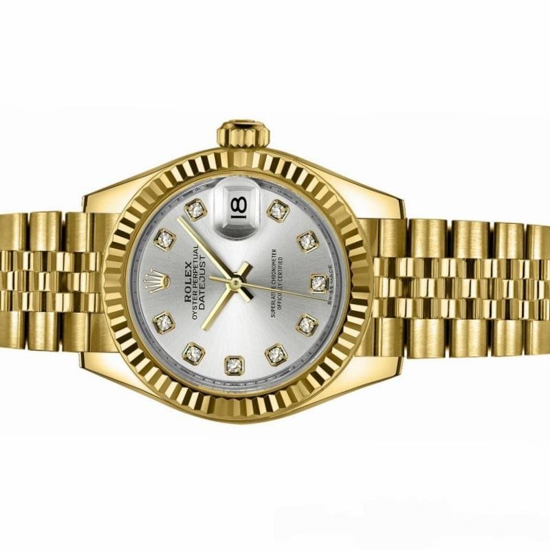 Rolex Datejust 279178 women’s watch, replica, silver dial with diamonds and 28 mm yellow gold. 28mm yellow gold round case with screw-down crown and yellow gold fluted bezel. Silver dial with diamond hour markers. Date window at 3 o’clock. Polished solid yellow gold Jubilee bracelet and hidden Crownclasp folding buckle.