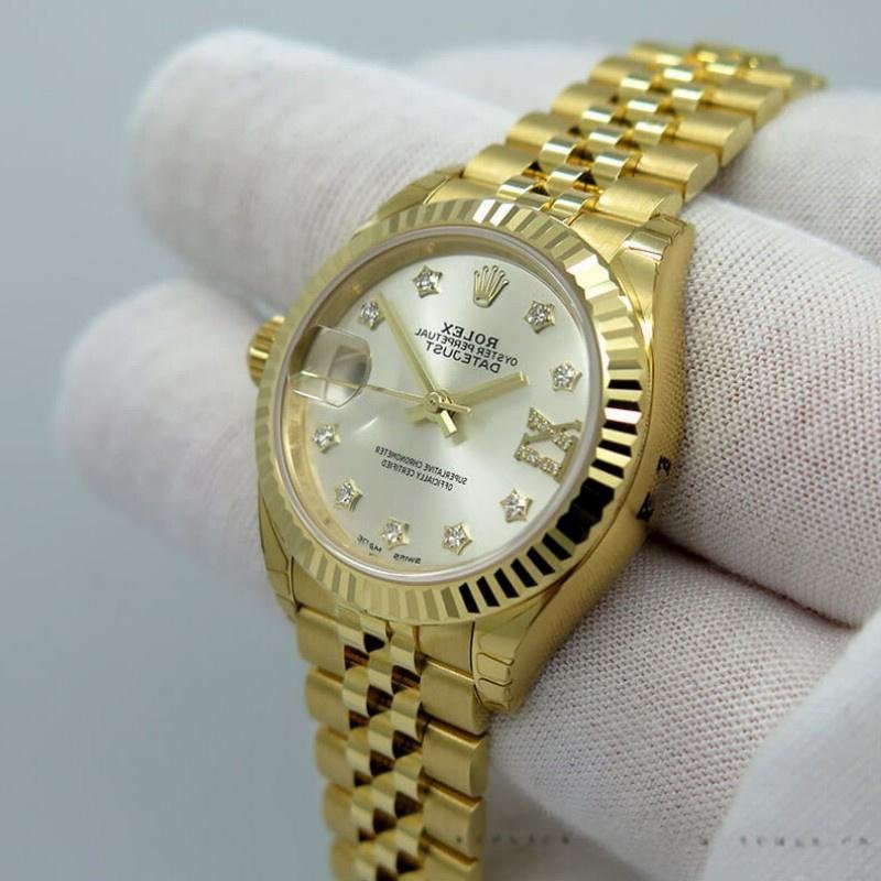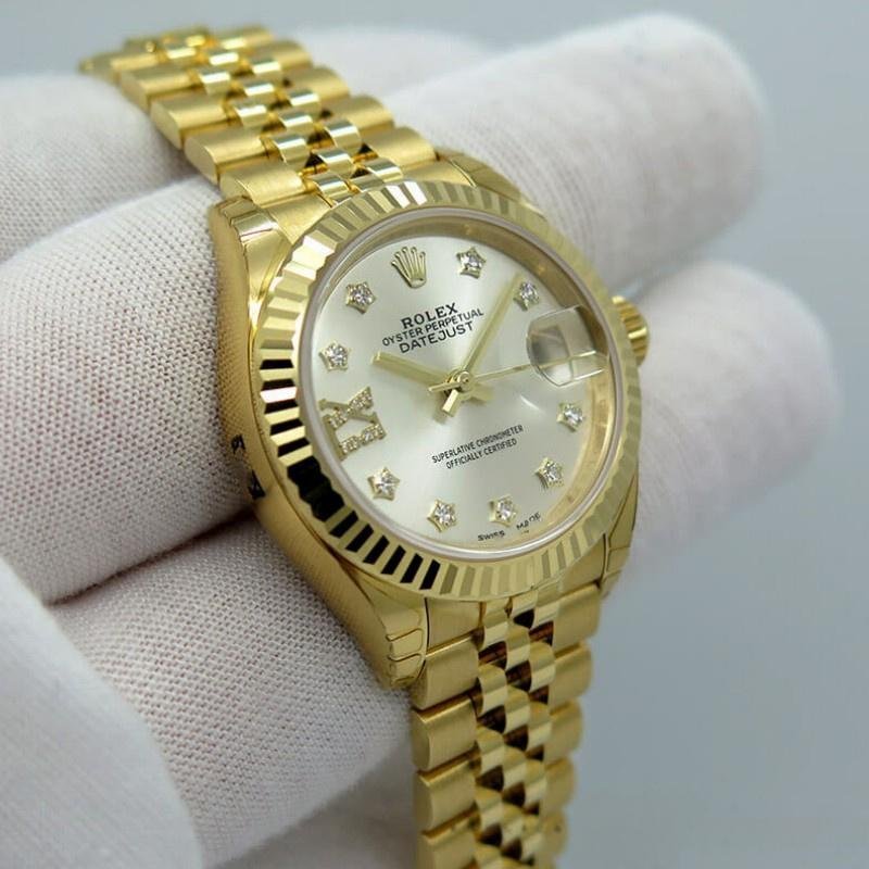 Rolex Datejust 279178 women’s watch, replica, silver dial with diamonds and fluted bezel, 28 mm. 28mm yellow gold round case with screw-down crown and yellow gold fluted bezel. Silver dial with diamond indexes. Roman numeral IX filled with diamonds at 9. Yellow gold President bracelet with three-piece semicircular links and hidden Crownclasp folding clasp.
