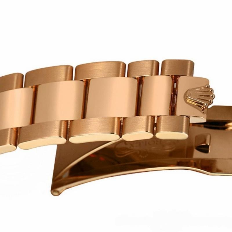 Rolex Day-Date 118205 rose gold watch, pink Jubilee dial with diamonds, 36mm, unisex. Jubilee pink dial. The dial is surrounded by a rose gold domed bezel. Time markers with diamonds, two of them baguette at 6 and 9, day indicator at 12 and date indicator at 3. 36mm rose gold case, bezel, rope mechanism, President bracelet and folding clasp, and sapphire crystal.