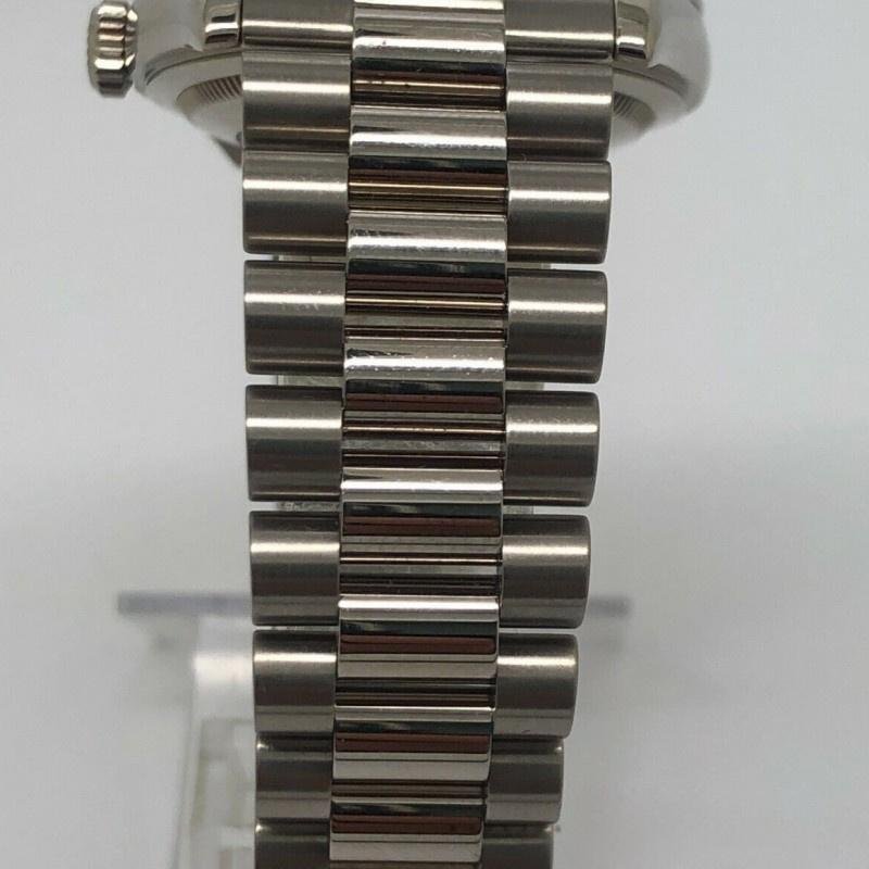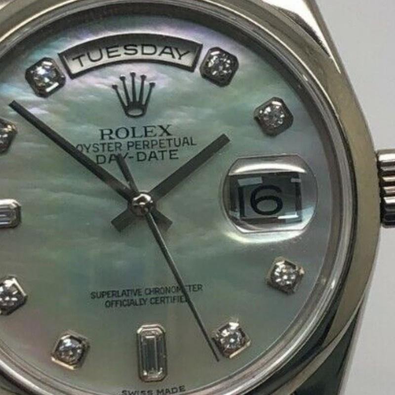 Rolex Day-Date 118206 watch, platinum, white mother-of-pearl dial and diamonds, 36 mm, unisex replica. 36mm diameter polished platinum round case with Twinlock screw-down crown, polished platinum domed bezel, solid-link platinum President bracelet with hidden clasp, white mother-of-pearl dial set with diamonds, round indexes and two baguette diamonds, day calendar at 12, date calendar at 3 and scratch-resistant sapphire crystal.