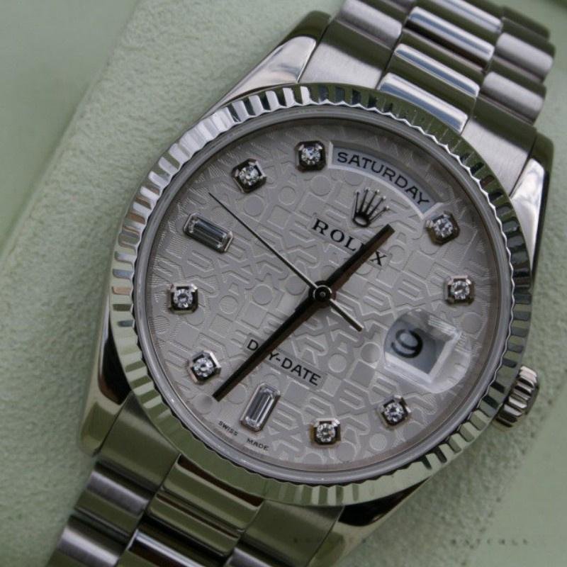 White gold Rolex Day-Date 118239 Jubilee unisex replica watch with silver dial and 36 mm. 36mm white gold case with white gold Rolex Oyster bracelet. White gold ribbed fixed bezel. Jubilee silver dial with diamonds set. 8 round hour markers and 2 baguette diamonds. Day of the week window at 12. Date window at 3 o’clock with cyclops magnifying glass. Scratch resistant sapphire crystal. Screw-down crown.