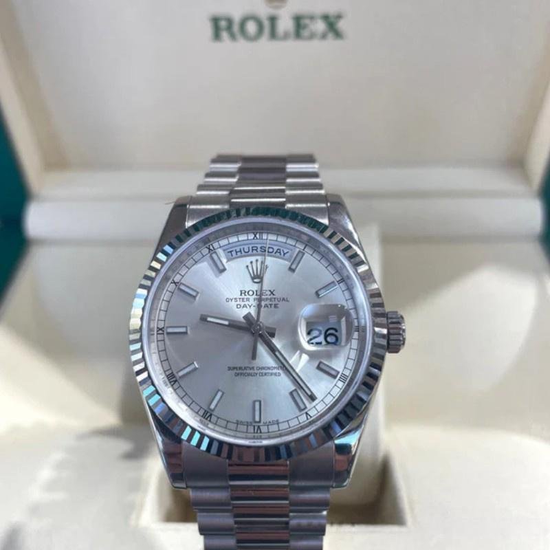 White gold Rolex Day-Date 118239 unisex replica watch, silver dial, fluted bezel, 36 mm. 36mm white gold case with white gold Rolex Oyster bracelet. White gold ribbed fixed bezel. Silver dial with bar markers. Day of the week window at 12. Date window at 3 o’clock with cyclops magnifying glass. Scratch resistant sapphire crystal. Screw-down crown.