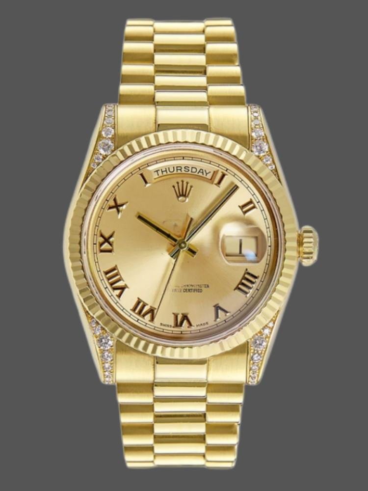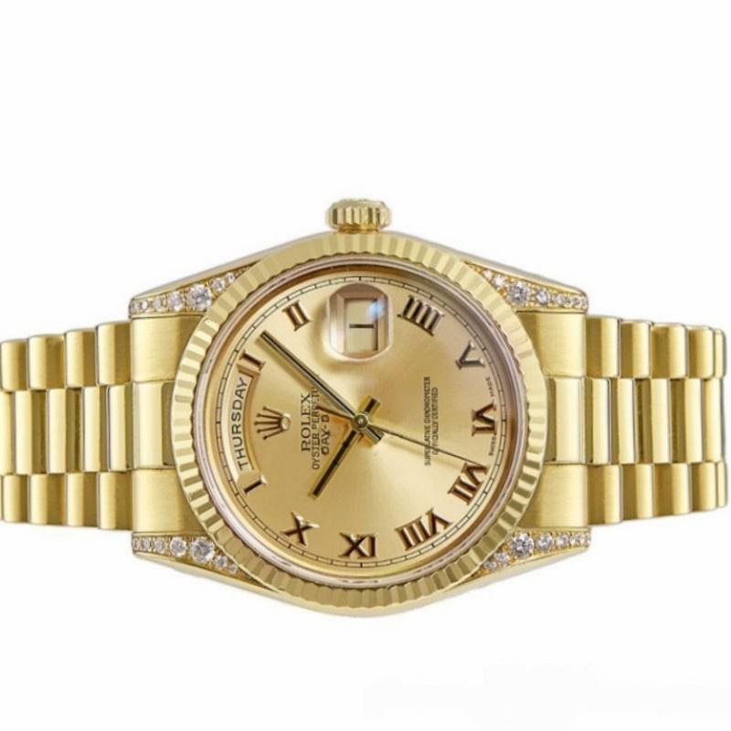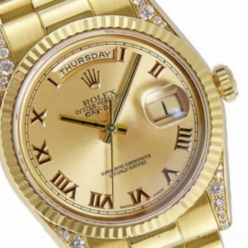 The Rolex Day-Date 118338, unisex watch with champagne Roman dial and 36mm diamond bezel, features a 36mm yellow gold case and scratch-resistant sapphire crystal with a solid screw-down crown. Round diamonds adorn the handles for a touch of luxury. The yellow gold ribbed bezel gives it a touch of elegance. The dial is champagne colored and includes Roman indexes, scratch resistant sapphire crystal with Cyclops magnifying glass. Day window at 12 and date window at 3. Yellow gold President bracelet with three-piece semicircular links and hidden Crownclasp folding buckle.