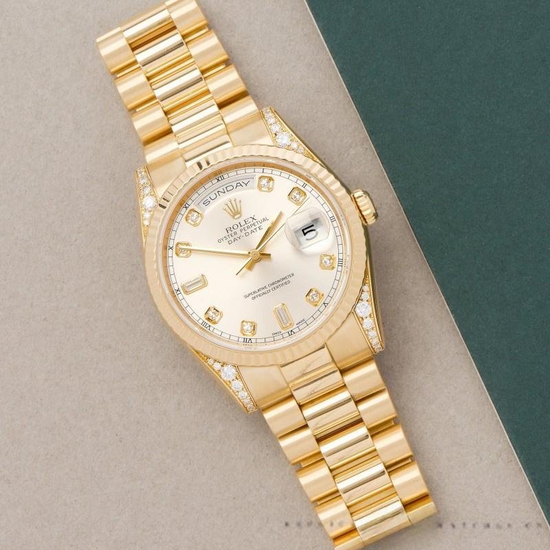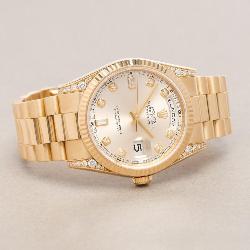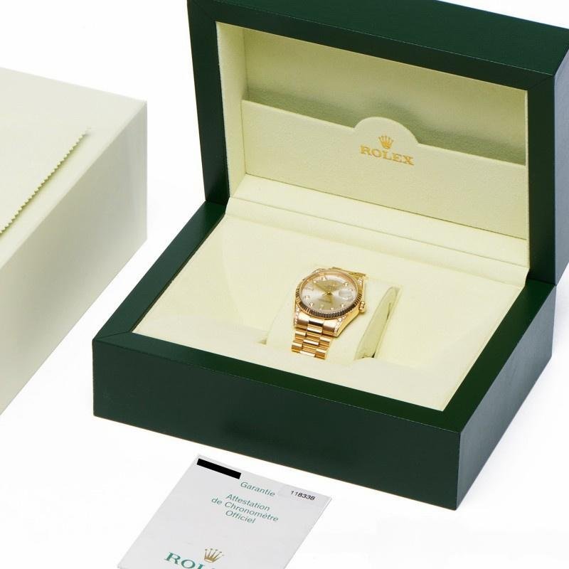 The Rolex Day-Date 118338, unisex yellow gold watch, silver dial, 36 mm, it has a 36mm yellow gold case and a scratch-resistant sapphire crystal with a solid screw-down crown. Round diamonds adorn the handles for a touch of luxury. The yellow gold ribbed bezel gives it a touch of elegance. Silver dial with gold hands and diamond indexes. The outer dial features minute indexes, a day window at 12 o’clock and a date window at 3 o’clock. The luxurious case features a yellow gold President bracelet with hidden folding crown clasp.