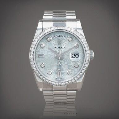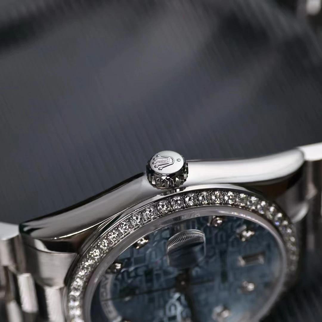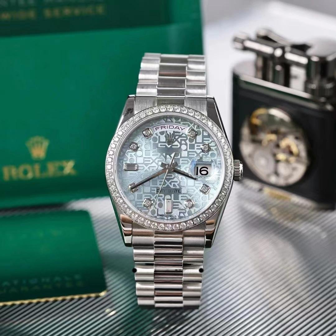 Rolex Day Date 118346 watch replica, blue diamond dial, platinum, 36 mm, unisex
