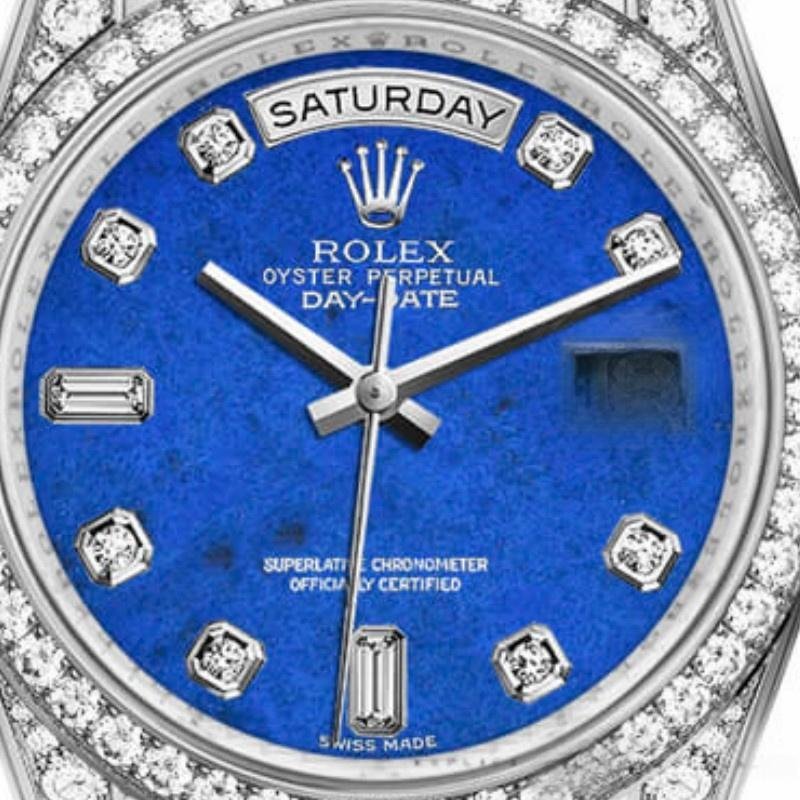 The Rolex Day-Date 118389, unisex replica with diamond bezel and 36mm lapis lazuli blue dial, features a 36mm white gold case, blue dial, hour markers with round sparkling diamonds and baguette diamonds at 6am and 9am. Scratch resistant sapphire crystal with Cyclops magnifying glass. Day of the week window at 12 noon. Date window at 3 o’clock. White gold presidential bracelet with folding buckle.