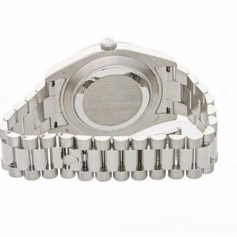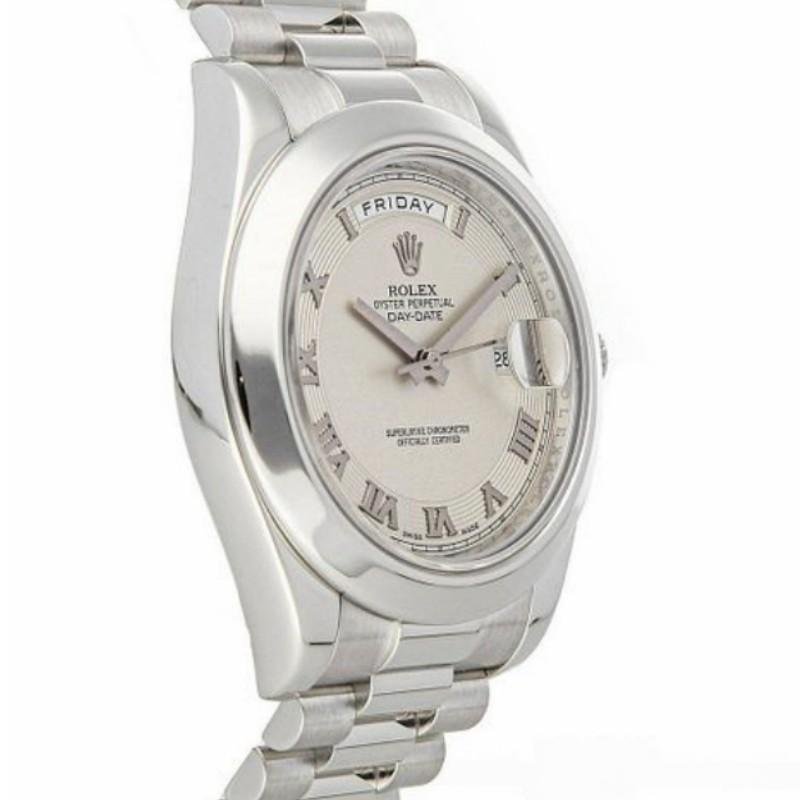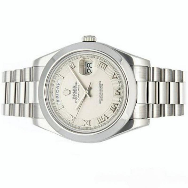 Rolex Day-Date 218206 men’s watch, platinum replica, with concentric circle dial in ivory and Roman numerals, 41 mm. It features a 41mm round platinum case with screw-down crown and platinum bezel. Scratch resistant sapphire crystal with Cyclops magnifying glass. Ivory concentric circle dial with Roman numeral hour markers. Date window at 3 and day window at 12. The platinum President bracelet will look perfect on your wrist.