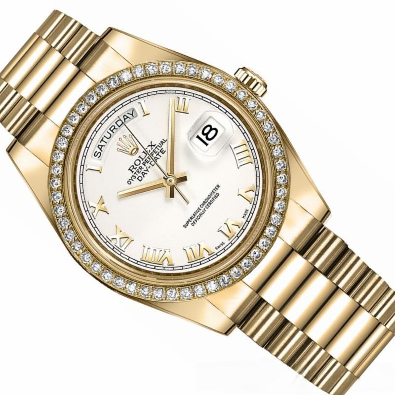 Rolex Day-Date 218348 Men’s Watch, Replica, White Roman Dial, 41mm. 41mm yellow gold case with solid bottom, screw-down crown and diamond bezel. Scratch resistant sapphire crystal with Cyclops magnifying glass. White dial with Roman numeral time markers, date window at 3 o’clock and day window at 12 o’clock. Three-link yellow gold presidential bracelet with folding clasp.