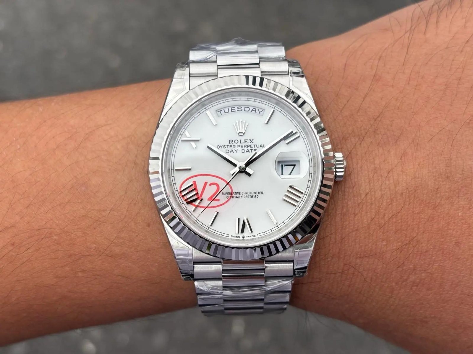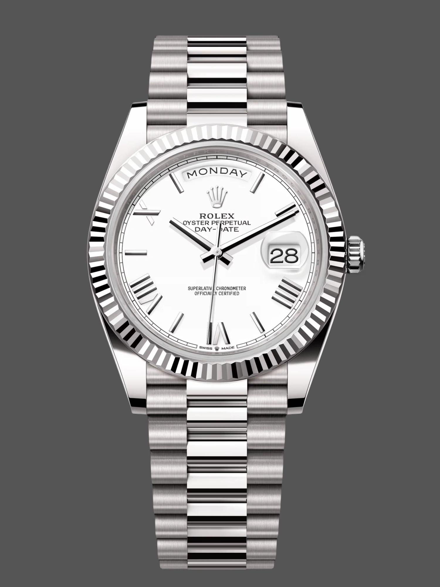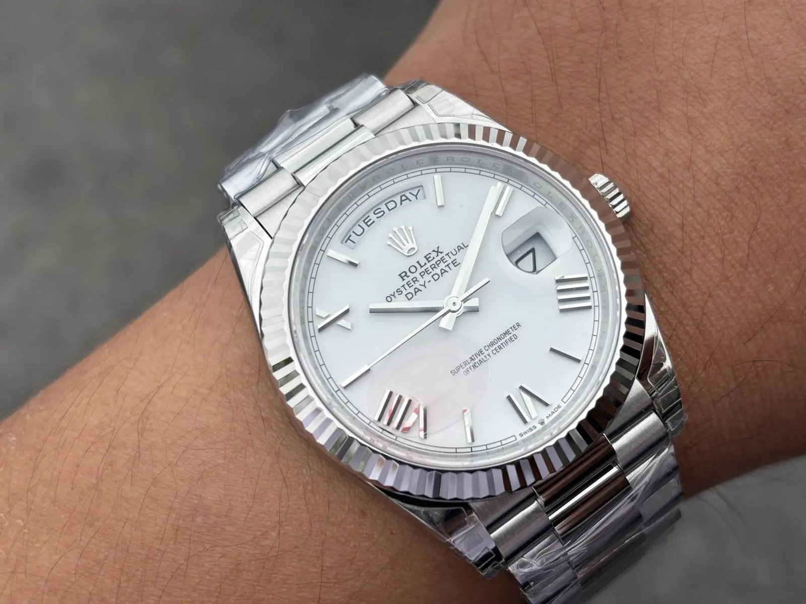 Rolex Day-Date 228239 Men’s Watch Replica White Roman Dial Fluted Bezel 40mm