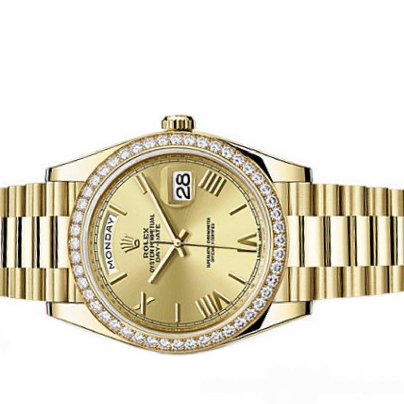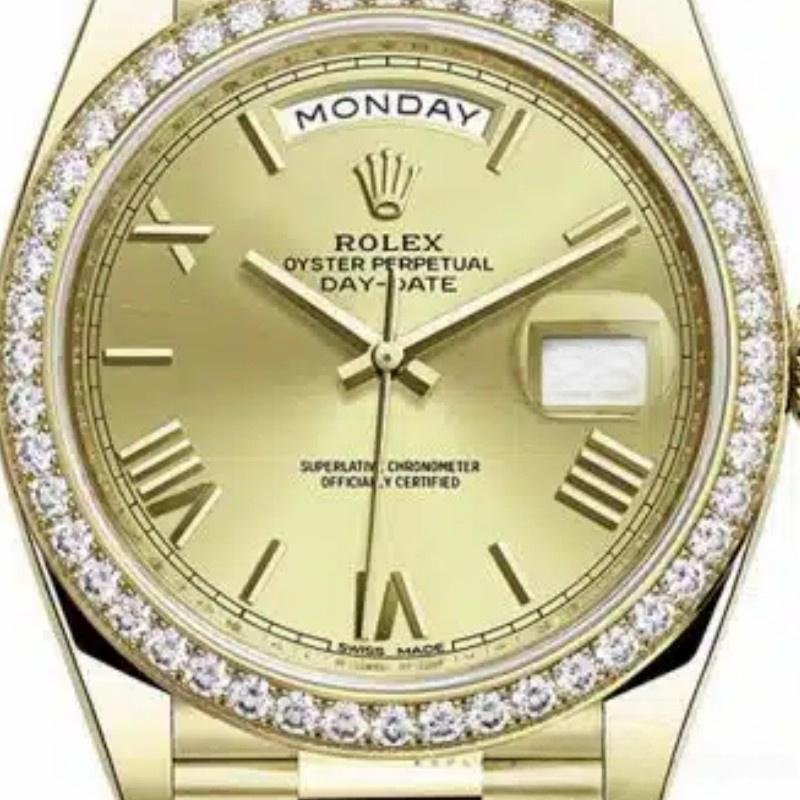 Rolex Day-Date 228348RBR men’s watch, replica, champagne-colored Roman dial, diamond bezel, 40mm. 40mm yellow gold case, solid bottom with screw-down crown and diamond bezel. Scratch resistant sapphire crystal with Cyclops magnifying glass. Champagne dial, time markers with Roman numerals, date window at 3 o’clock, day of the week window at 12 o’clock. Three-piece presidential bracelet in yellow gold with folding clasp.