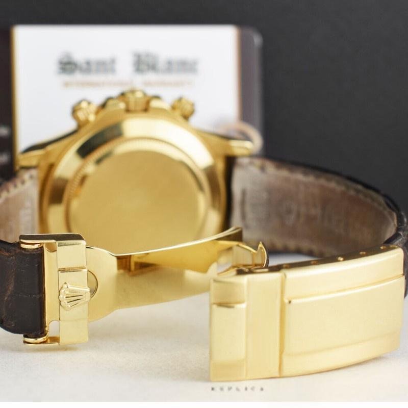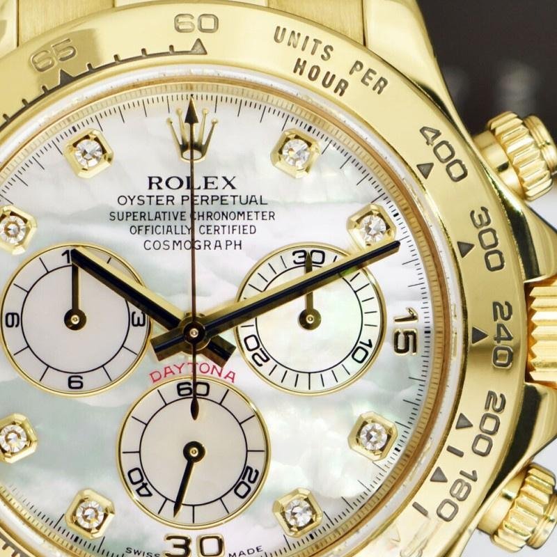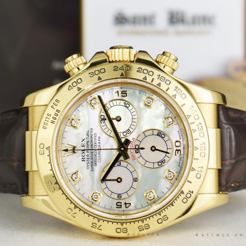 Rolex Daytona 116518 MOP replica watch with 40 mm yellow gold diamond dial for men. 40mm yellow gold case. Fixed bezel with engraved tachymeter. Scratch resistant sapphire crystal. Mother-of-pearl dial with diamond indexes. Small seconds hand at 6 a.m. Central chronograph hand, 30-minute counter at 3 o’clock and 12-hour counter at 9 o’clock. Brown leather strap with yellow gold folding buckle. A high-end watch with an impressive look.