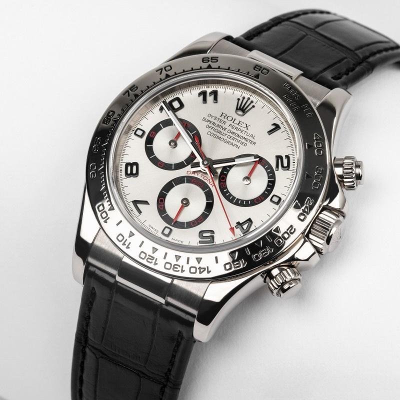 Rolex Daytona 116519 replica watch for men, with black alligator leather strap and 40 mm silver dial. 40 mm case, the unusual silver and black “Racing” dial with striking red details. Black Arabic numerals, details on the red dial, red secondary seconds hand and small chronograph hands. White gold tachymetric bezel, chronograph functions, center-scanning red center seconds hand, sapphire crystal. Black alligator leather strap with white gold folding clasp.
