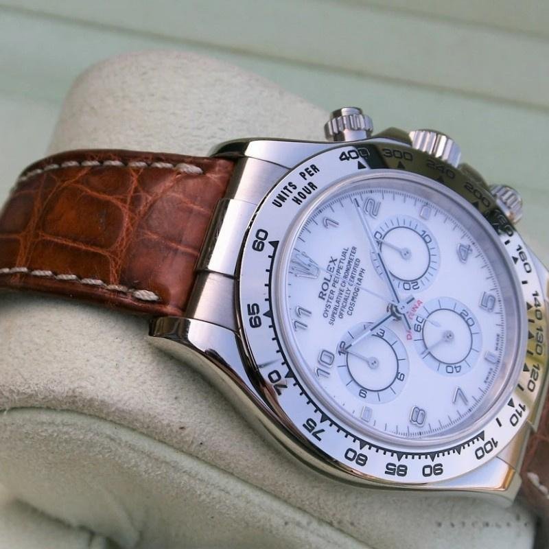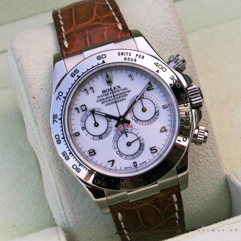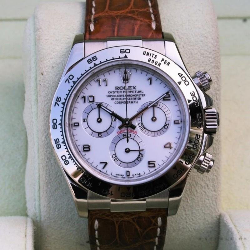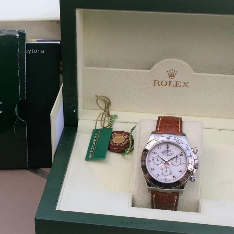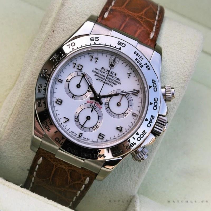 Rolex Daytona 116519 replica watch for men, white Arabic dial, brown leather strap, 40mm. 40mm white gold case. White dial with luminous Arabic hands and indexes. Fixed bezel with engraved tachymeter. Brown leather strap with design. Scratch resistant sapphire crystal. Screw-down crown and chronograph buttons. White gold folding buckle.