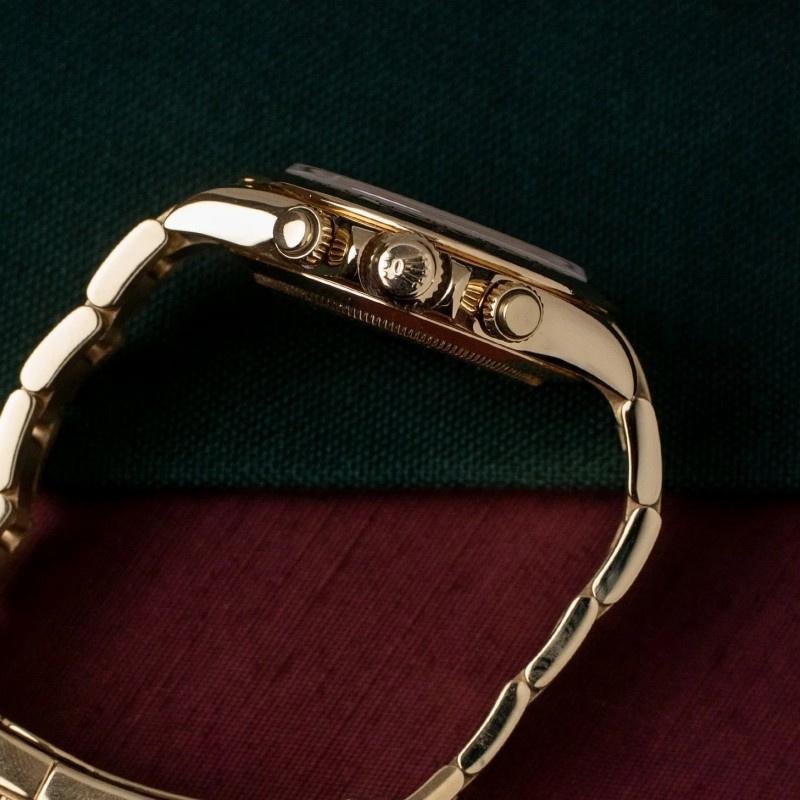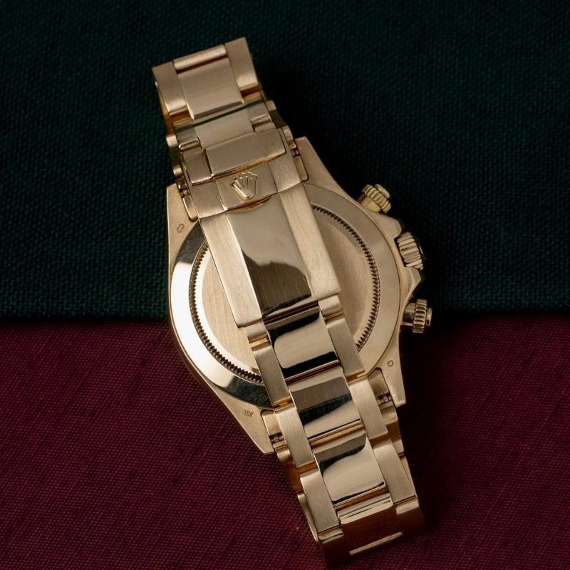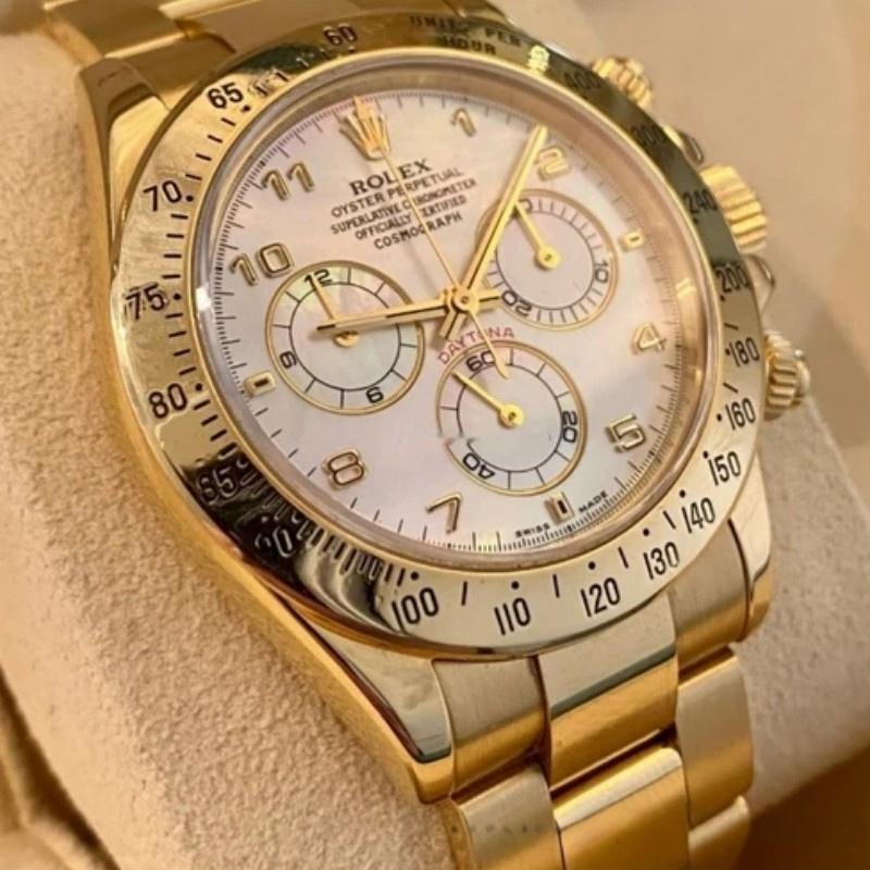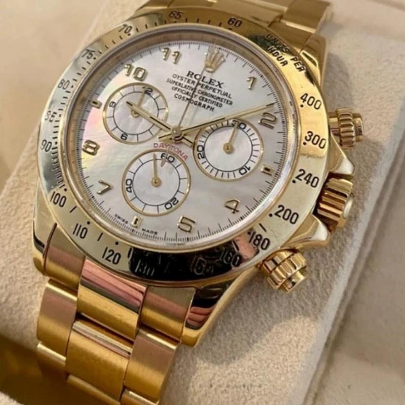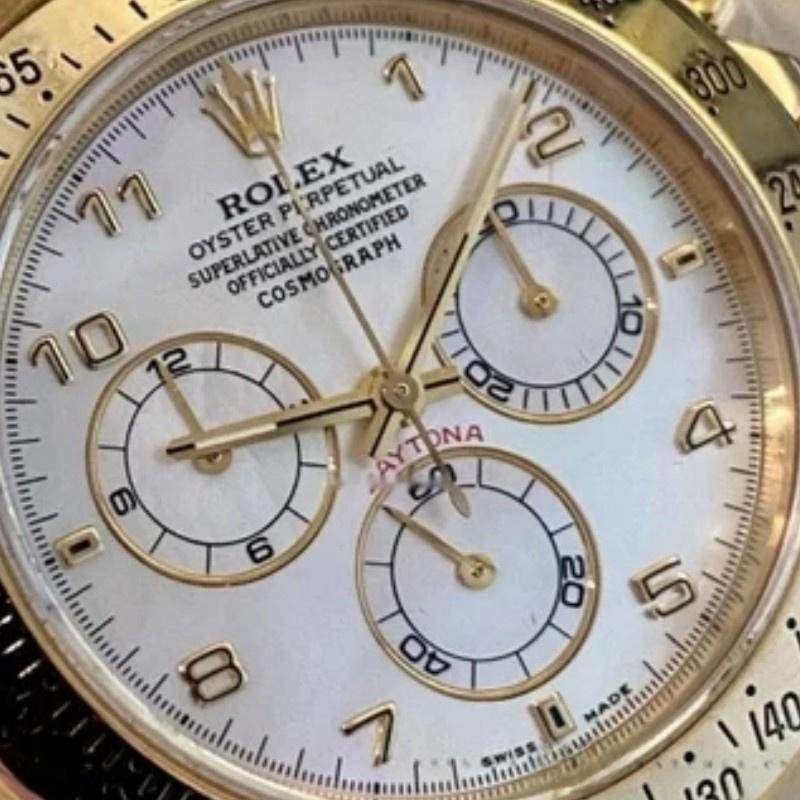 Rolex Daytona 116528 replica watch for men, mother-of-pearl dial, 40 mm. 40 mm diameter yellow gold case with crown and screwed buttons with Triplock system, crown protector, polished yellow gold bezel with tachymetric engraving, yellow gold Oyster bracelet with Oysterlock clasp. The mother-of-pearl dial features a charming milky hue and incorporates hour markers with applied yellow gold Arabic numerals. Scratch resistant sapphire crystal. This gives this sports chronograph an almost dreamlike quality.