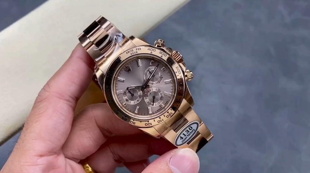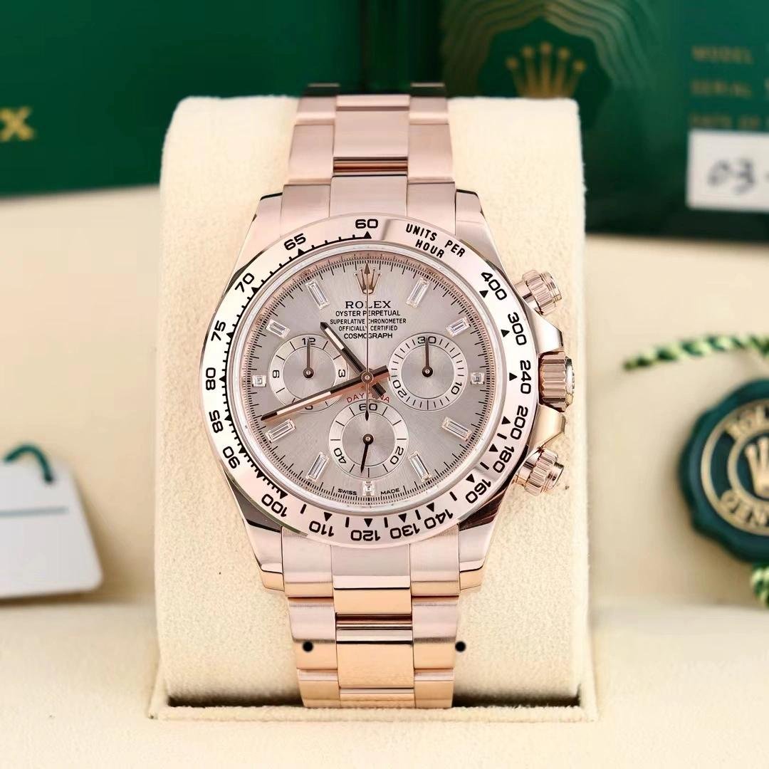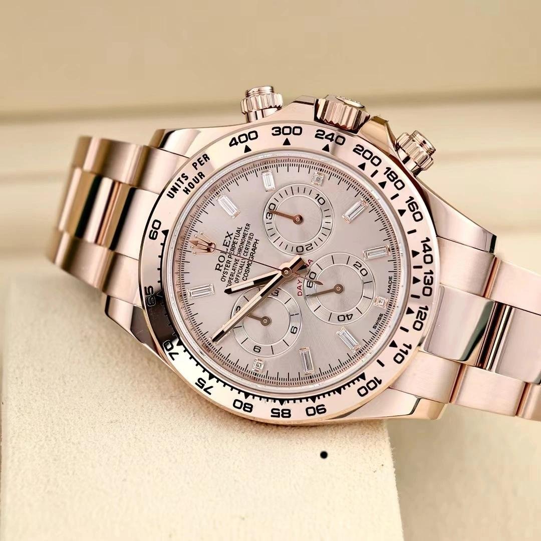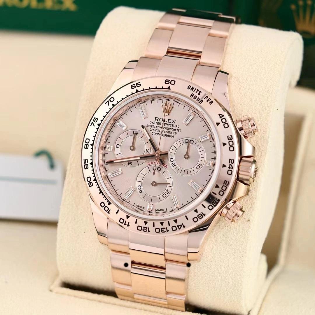 Rolex Daytona m116505 Everose Gold replica watch with 40 mm sun powder pink dial for men. Everose gold case 40 mm diameter. Crown with triple safety closure protected by crown protectors. Everose gold bezel with tachymetric engraving. Scratch resistant sapphire crystal. Sun dust pink dial with hourly indexes. 30 minute counter at 3. Small seconds hand at 6 with the inscription “Daytona” in red and 12-hour counter at 9. Everose gold Oyster bracelet with safety clasp.