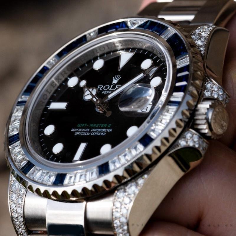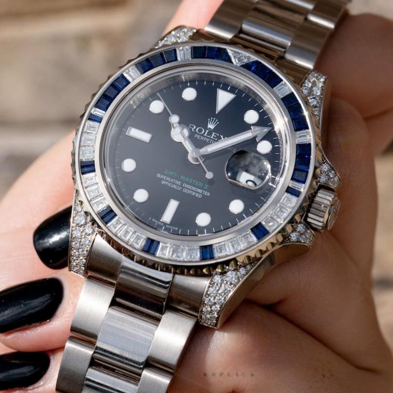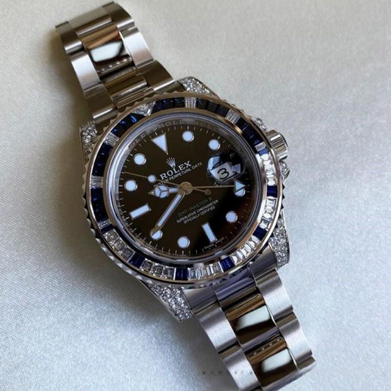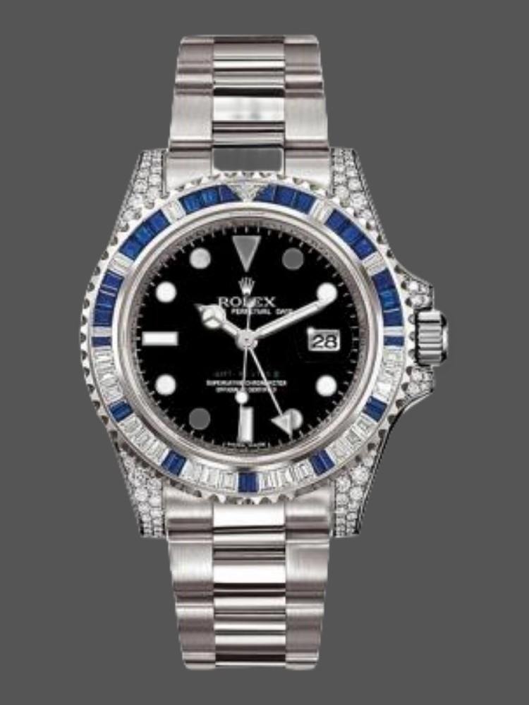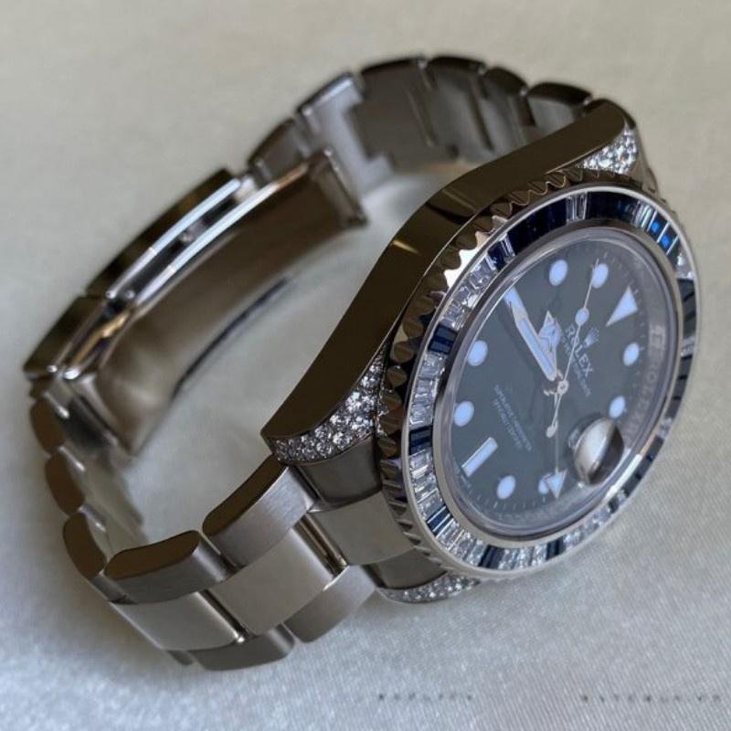 The Rolex GMT Master II 116759SA, men’s replica, black dial, white gold, 40 mm, features a 40 mm white gold case and handles decorated with diamonds. Bezel with 29 diamonds and 30 sapphires, black dial with dot and index hour markers, date window at 3 o’clock, Cyclops lens on the date, white gold Oyster bracelet with folding clasp.