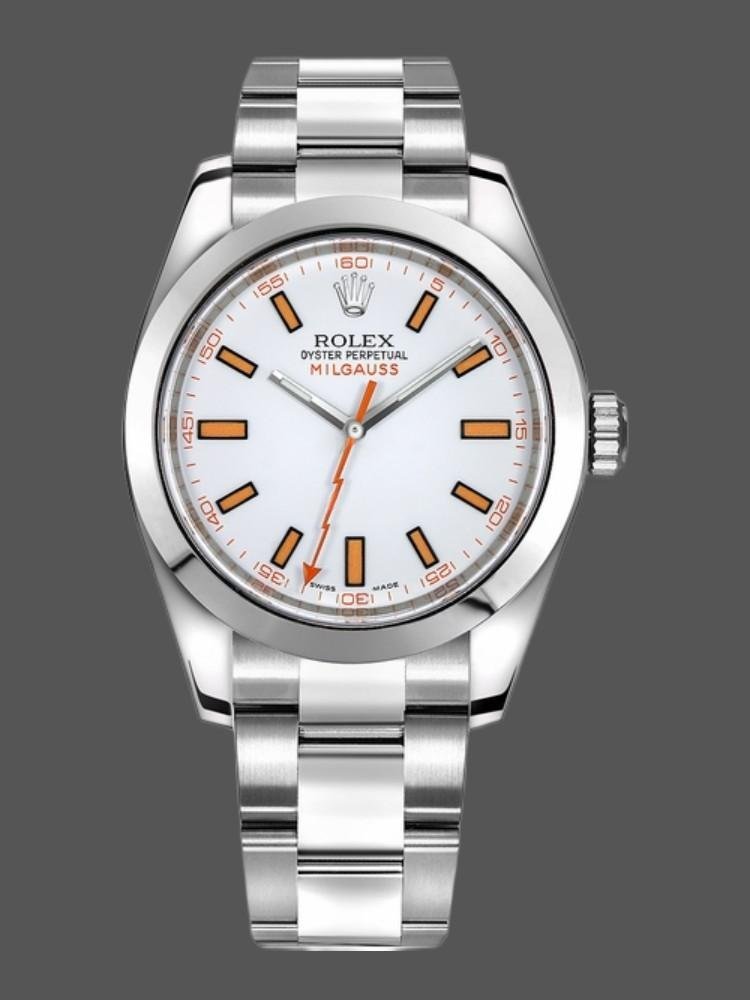 Rolex Milgauss 116400 automatic replica watch for men, white dial, 40 mm. 40 mm diameter stainless steel case. Smooth stainless steel domed bezel. White dial, orange seconds hand in the shape of a “lightning” and 60 seconds/minute indices. Oyster stainless steel bracelet with safety clasp. Compatible with 20 cm dolls.