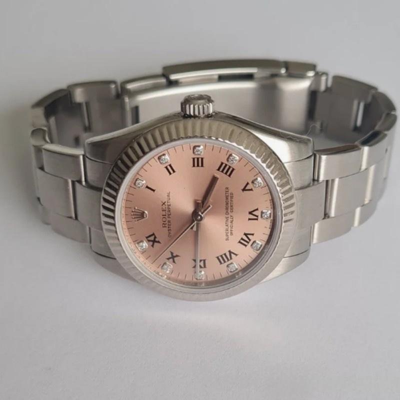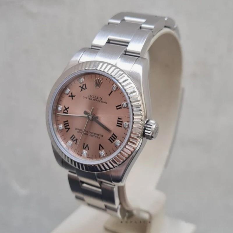 Rolex Oyster Perpetual 176234 replica watch for women with fluted bezel, pink dial and diamonds, 26 mm. 26 mm diameter stainless steel Oyster case. White gold fluted bezel. Scratch resistant sapphire crystal. Pink dial with Roman numerals and diamond indices. Oyster stainless steel bracelet with folding clasp.