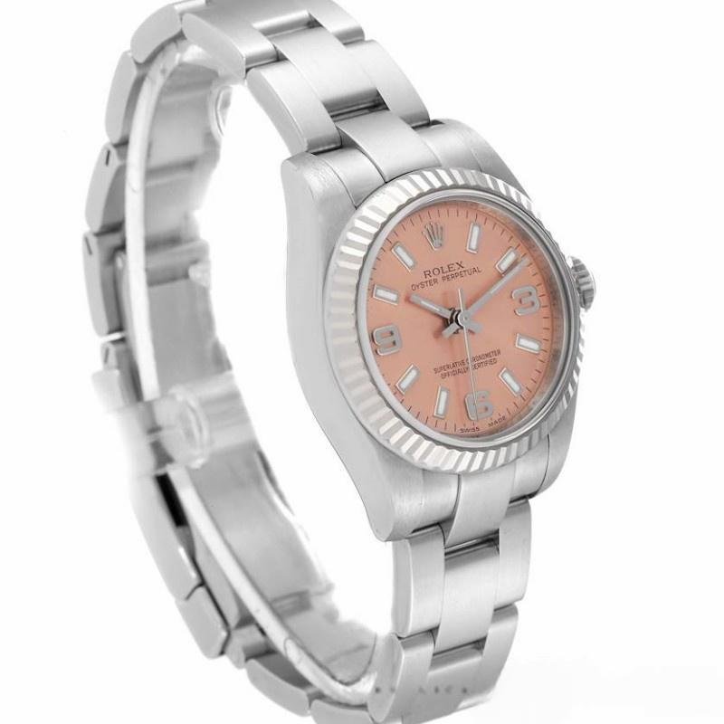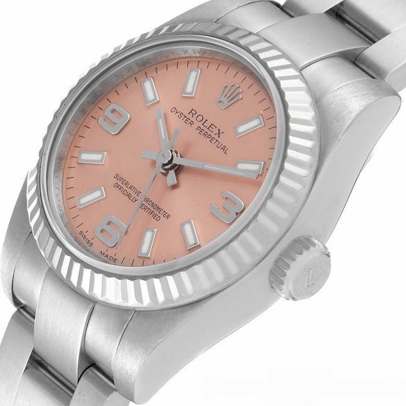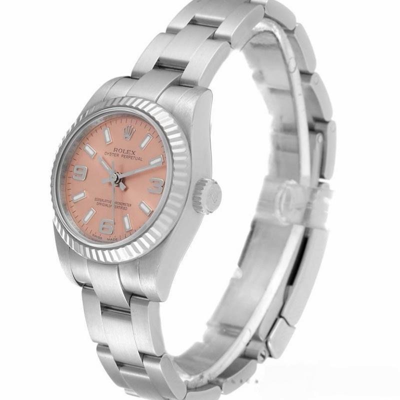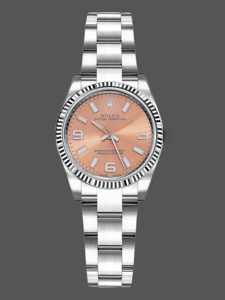 Rolex Oyster Perpetual 176234 replica watch for women with fluted bezel, pink dial, 26 mm. 26mm diameter stainless steel Oyster case. White gold fluted bezel. Scratch resistant sapphire crystal. Pink dial with Arabic numerals and indexes. Oyster stainless steel bracelet with folding clasp.