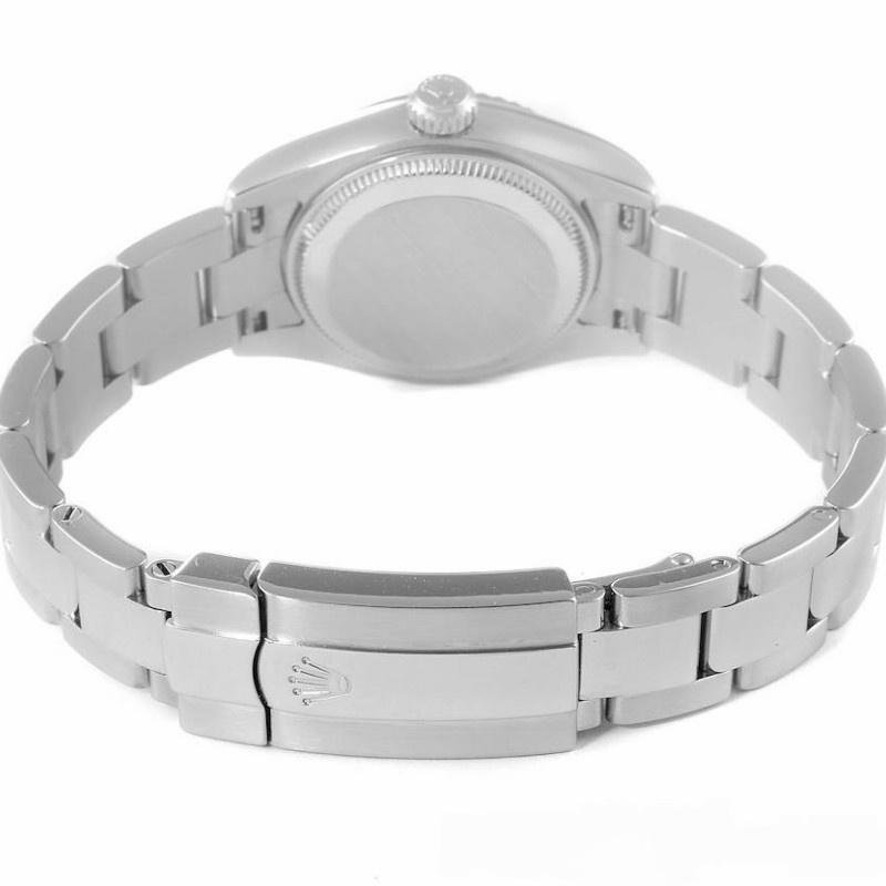 Rolex Oyster Perpetual 176234 replica watch for women, black dial with Roman numerals and diamonds, 26 mm. 26 mm diameter stainless steel Oyster case. White gold fluted bezel. Scratch resistant sapphire crystal. Black dial with Roman numerals and diamond indices. Oyster stainless steel bracelet with folding clasp.