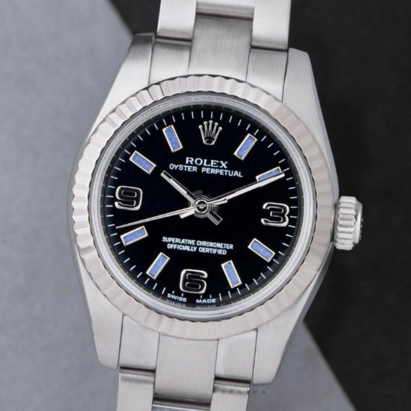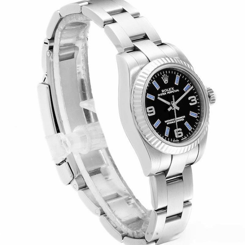 Rolex Oyster Perpetual 176234 replica watch for women, black dial, blue dial, 26 mm. 26 mm diameter stainless steel Oyster case. White gold fluted bezel. Scratch resistant sapphire crystal. Black dial with Arabic numerals and luminous blue cane-type hour indices. Oyster stainless steel bracelet with folding clasp.