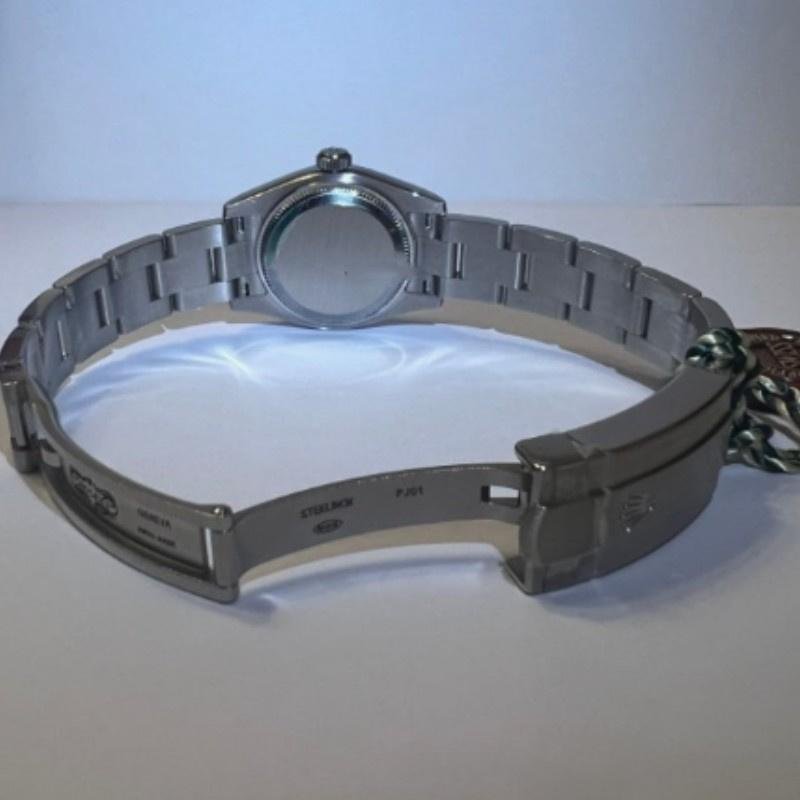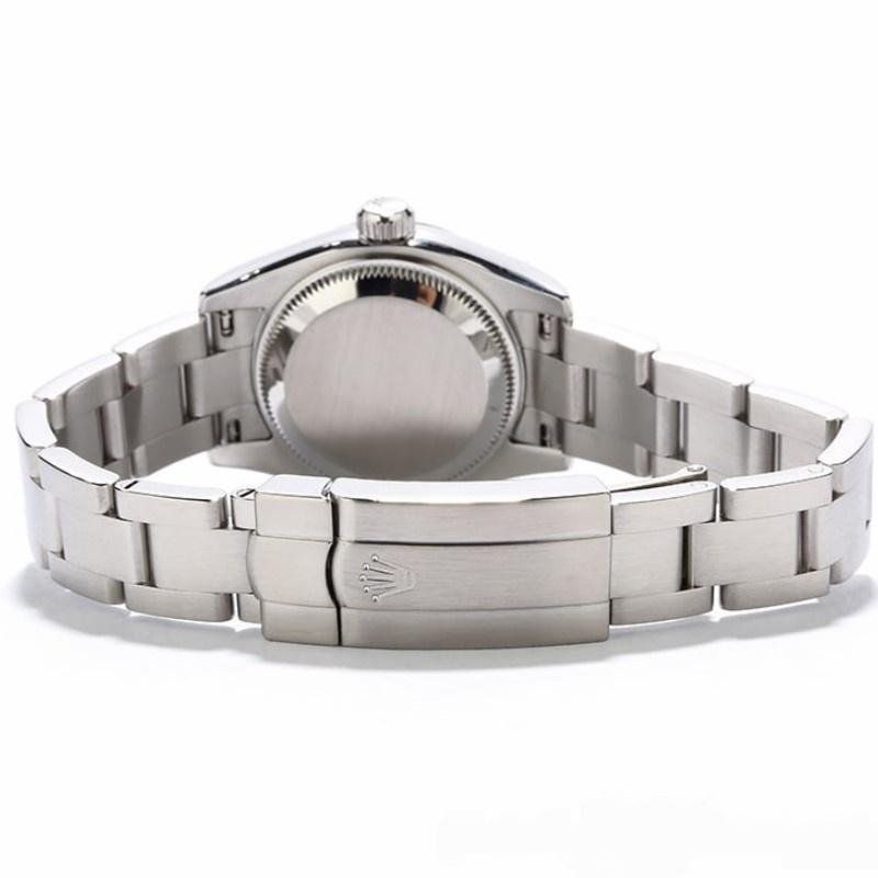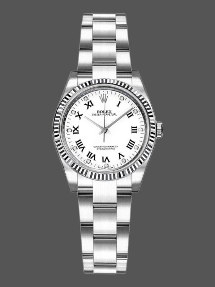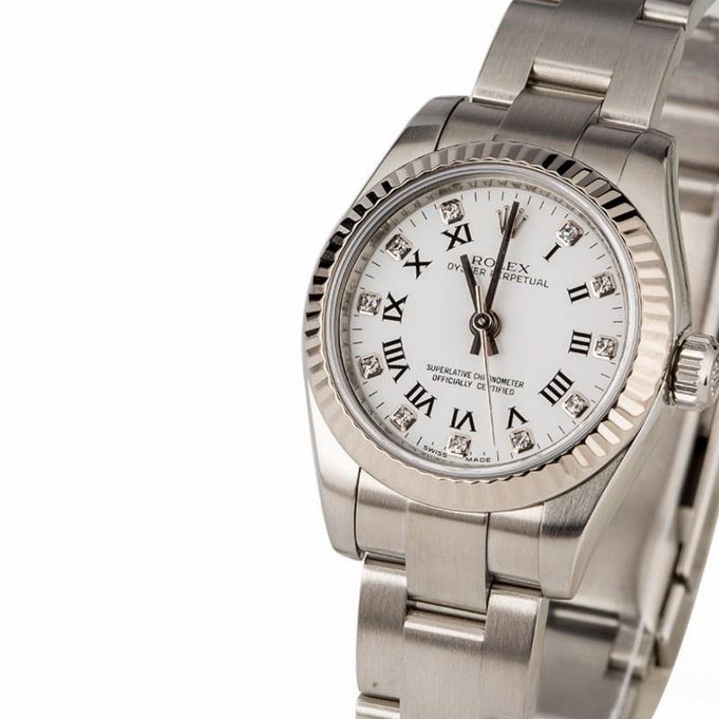 Rolex Oyster Perpetual 176234 Women’s Replica White Roman Dial 26mm Stainless Steel Oyster Case 26mm Diameter. White gold fluted bezel. Scratch resistant sapphire crystal. White dial with Roman numerals and diamonds. Minute markers around the outer edge. Oyster stainless steel bracelet with folding clasp.