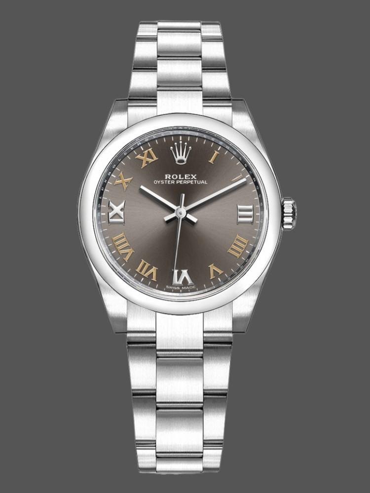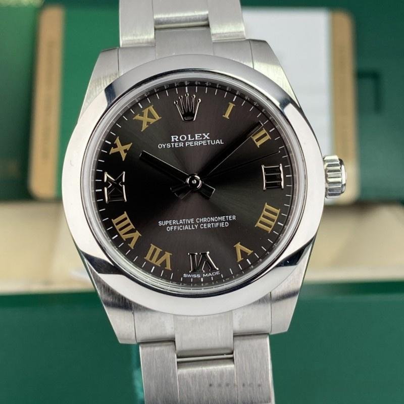 Rolex Oyster Perpetual 177200 replica watch for women, dark gray dial, domed bezel, 31 mm. 31 mm diameter stainless steel Oyster case. Smooth stainless steel domed bezel. Scratch resistant sapphire crystal. Dark gray dial with Roman numeral hour markers. Oyster stainless steel bracelet with folding clasp.