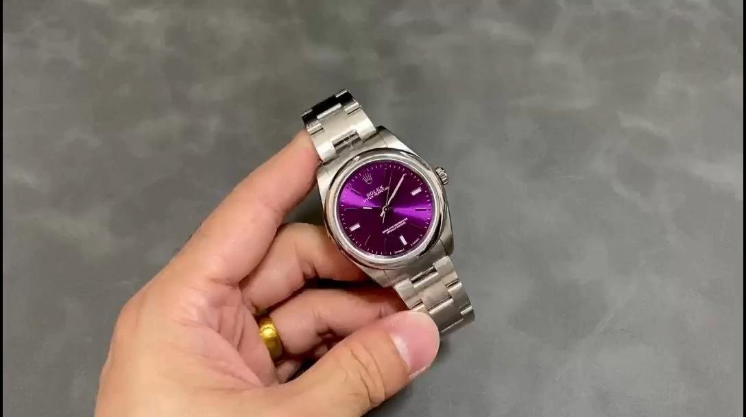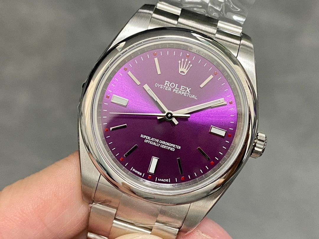 Rolex Oyster Perpetual Air-King 114200 unisex replica watch with grape red dial and 34 mm indices. 34 mm diameter stainless steel case. Smooth and fixed domed stainless steel bezel. Grape red dial with hour markers and indexes. Minute markers around the outer edge. Scratch resistant sapphire crystal. Screw-down crown. Solid caseback. Stainless steel Oyster bracelet with folding clasp.
